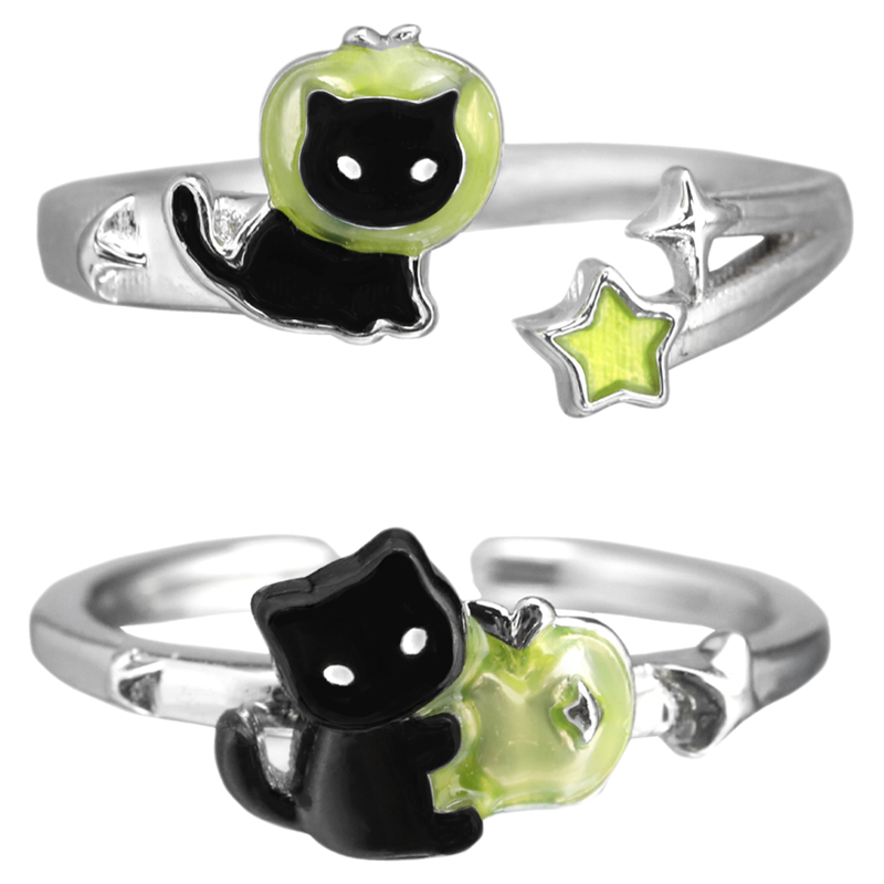 可爱原创黑猫青苹果戒指纯银不掉色小众甜酷情侣对戒可调节