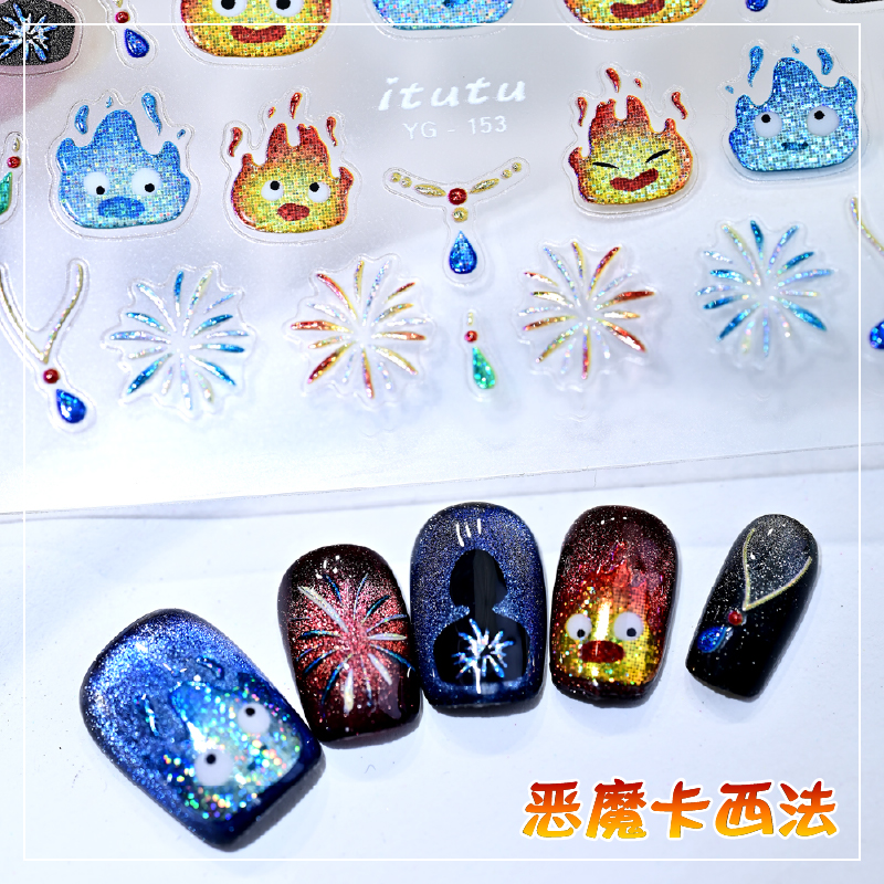 网红爆款恶魔卡西法爆闪火恶魔流星卡通贴纸哈尔的移动城堡美甲贴