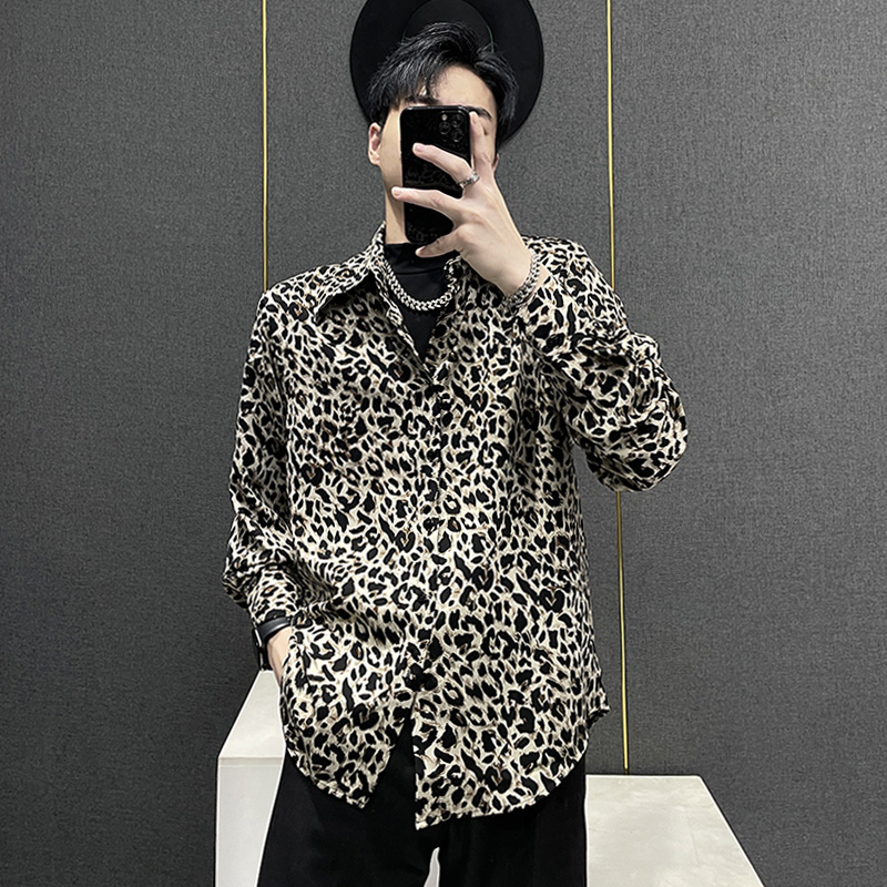 夏季高级感冰丝复古豹纹衬衫男长袖宽松个性网红免烫雪纺上衣ins