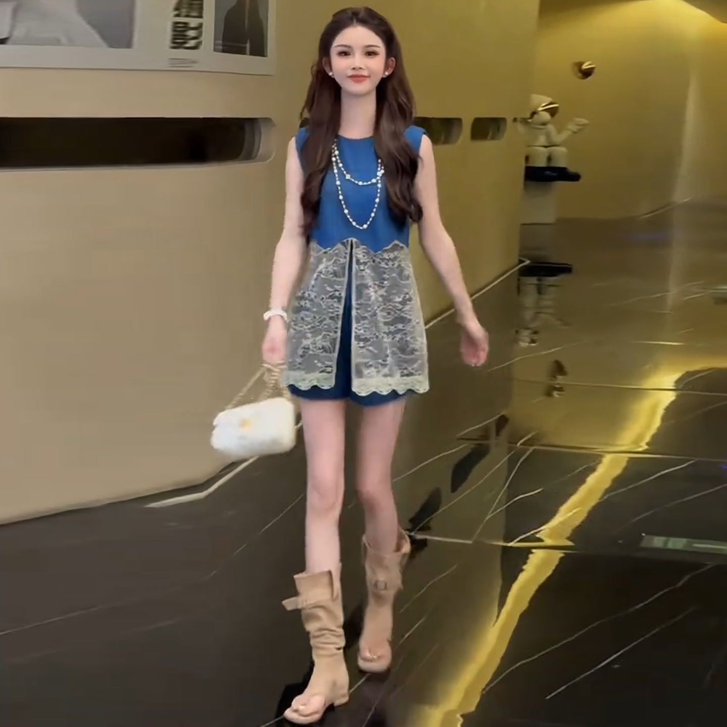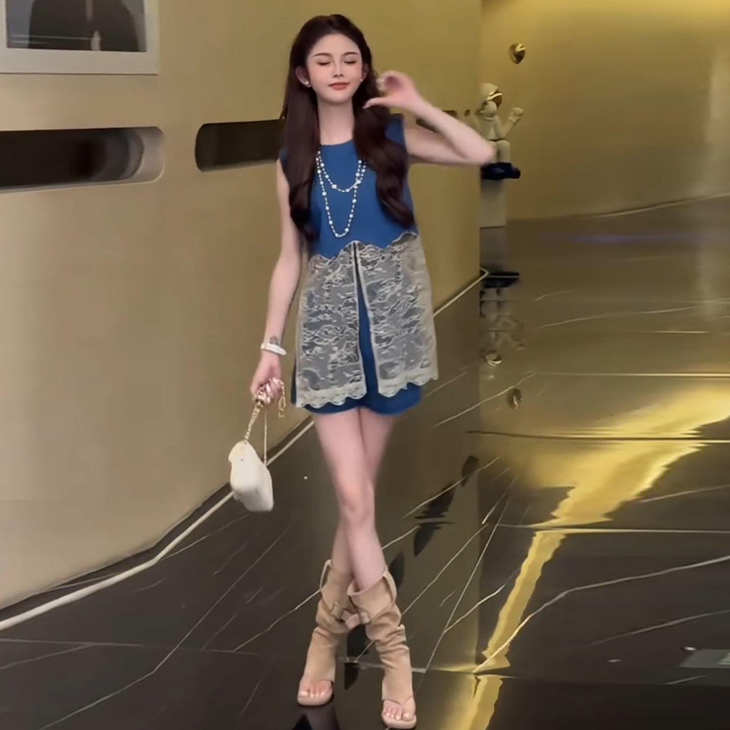 时尚洋气套装女2025夏季新款时髦显瘦蕾丝拼接无袖上衣短裤两件套