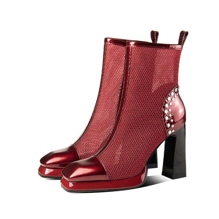 红漆皮镂空网靴子粗跟凉靴高跟时尚春秋短靴夏季女靴2025新款透气