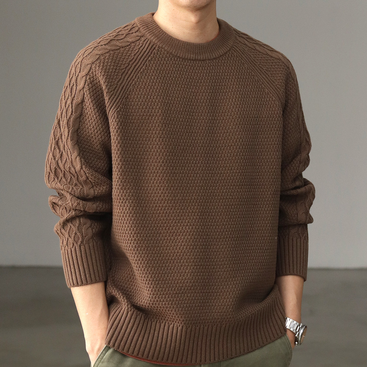 复古菠萝纹提花针织衫上衣慵懒休闲秋冬打底外穿圆领套头毛衣男