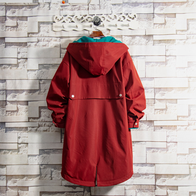 soinku春秋季红色中长款风衣男生款青年流行春季潮牌连帽大衣外套