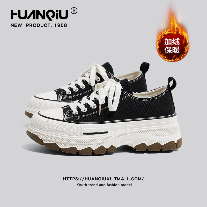 环球厚底加绒帆布鞋女2025新款秋冬季超火小众松糕底黑色休闲板鞋