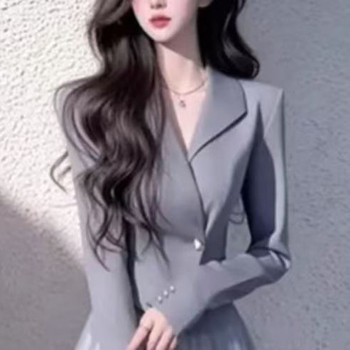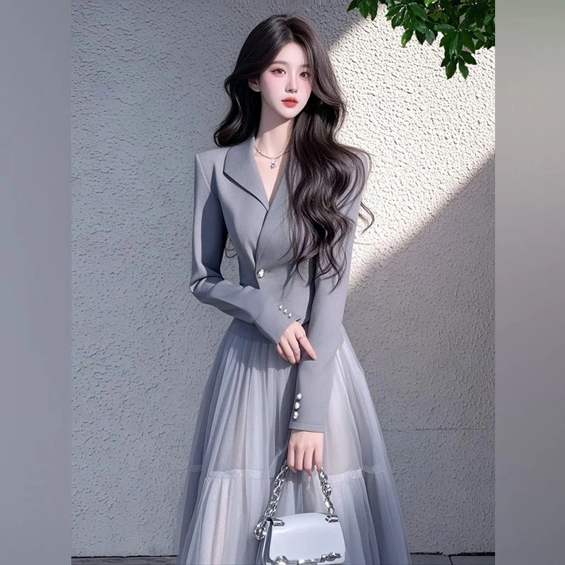 春秋新款职业OL女神范气质名媛小香风灰色西装外套网纱半身裙套装