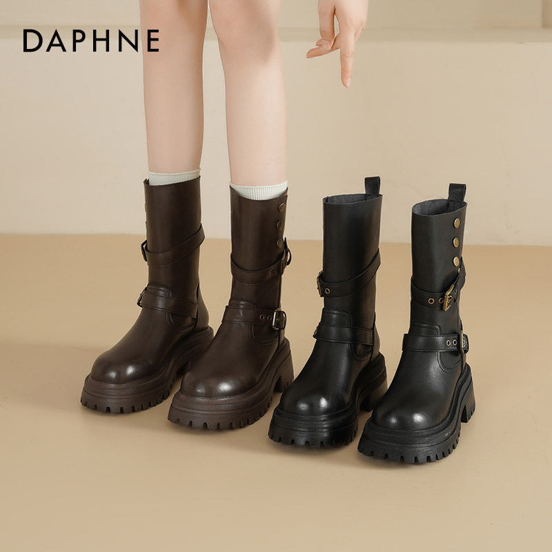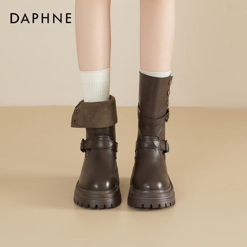 达芙妮厚底马丁靴女2025新款冬季加绒靴子骑士靴美拉德棕色短靴女