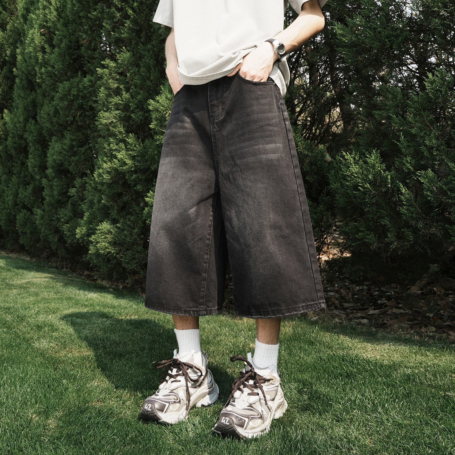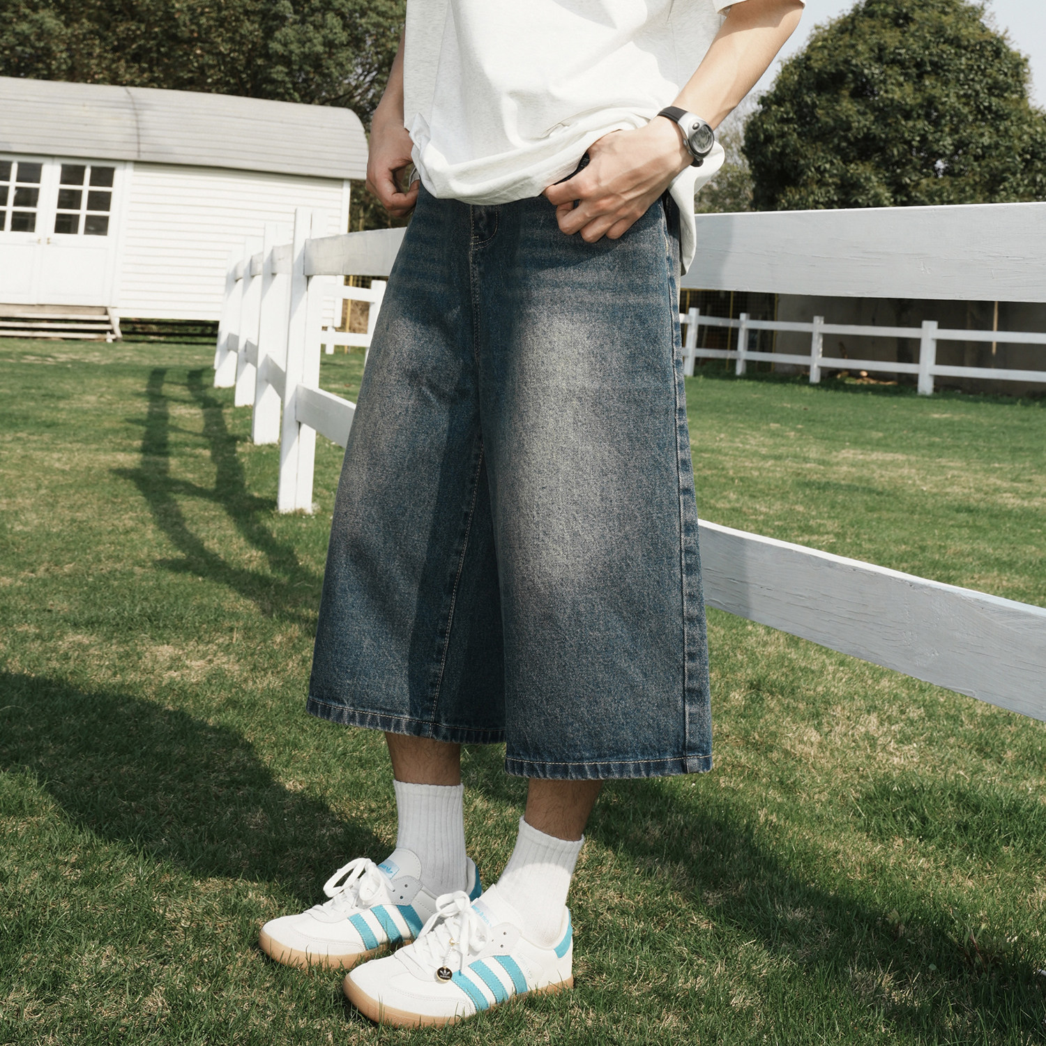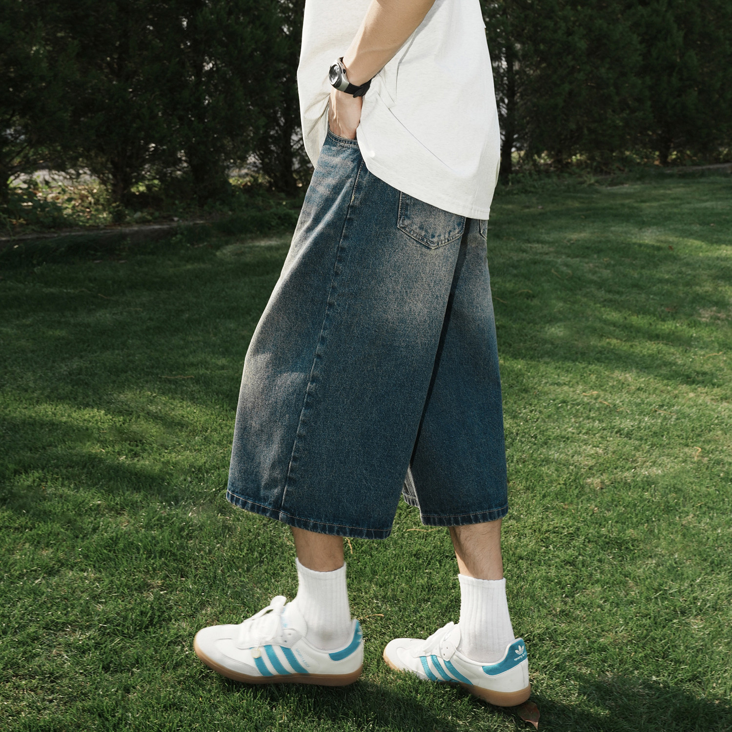GOGOSOON夏季新款牛仔裤420g男做旧水洗直筒宽松情侣百搭七分裤Q