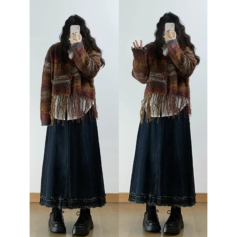 胖特大码女装毛边复古牛仔半身裙女春秋裙子高腰显瘦字中长裙