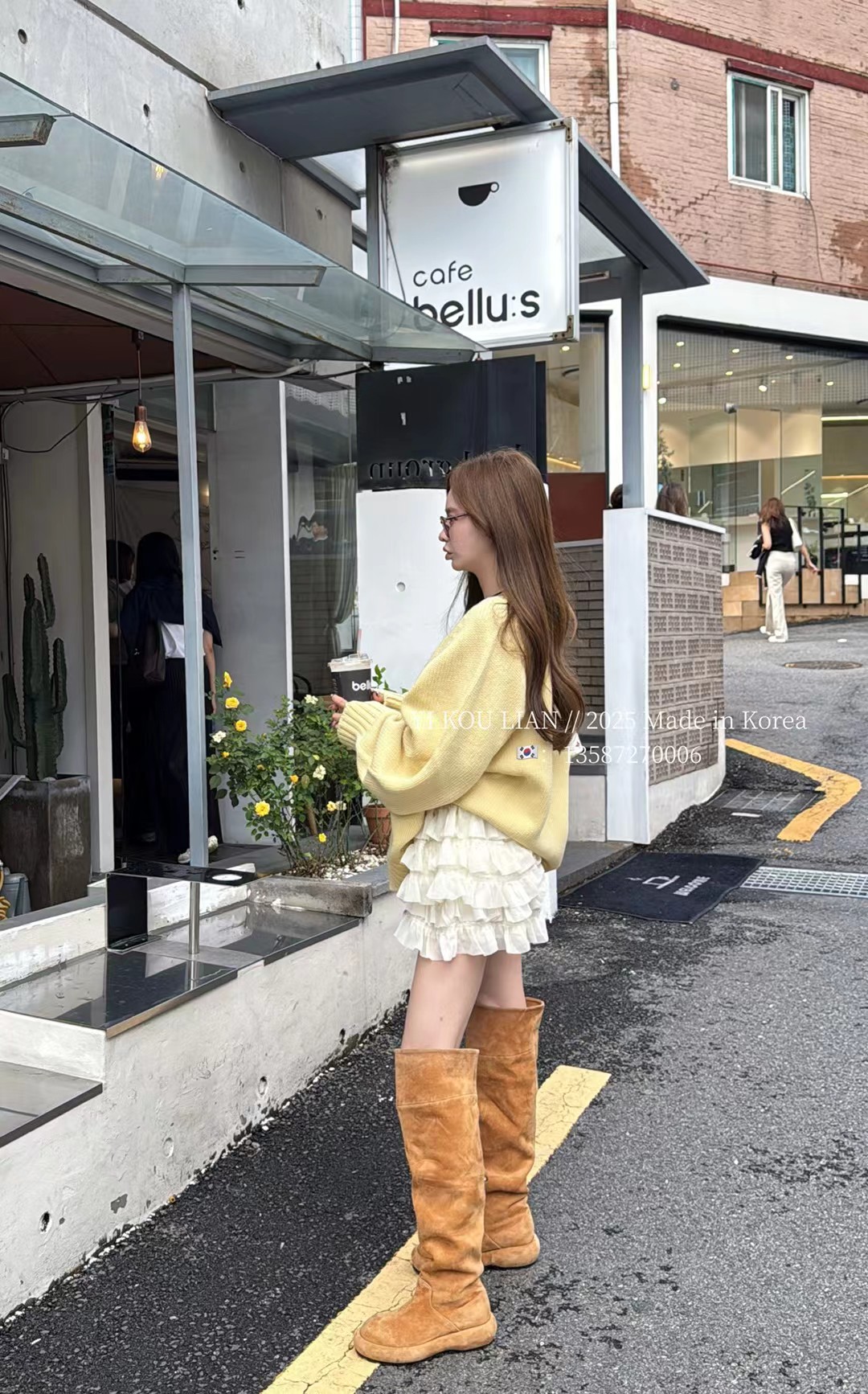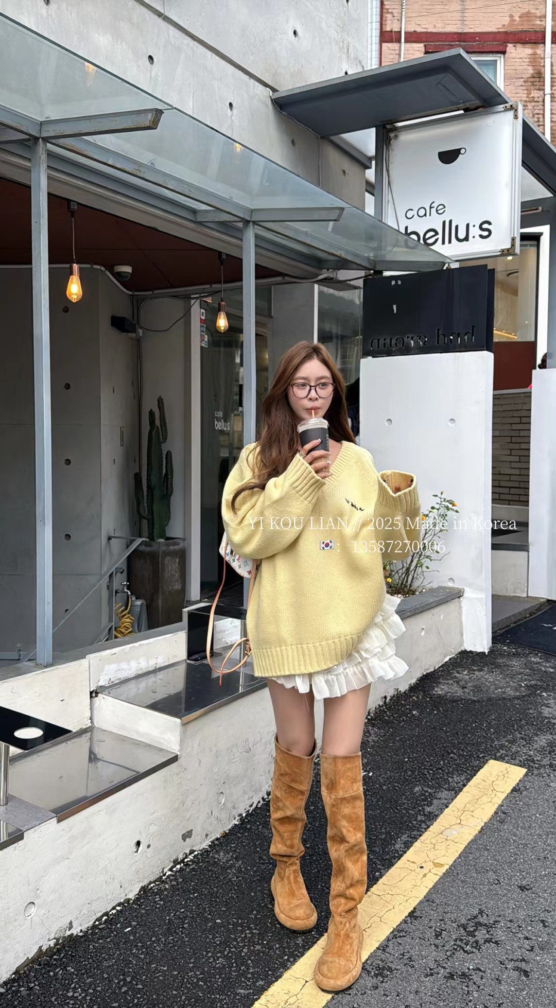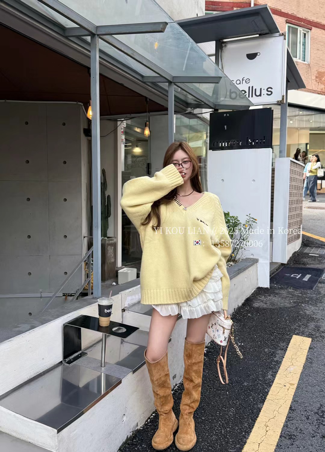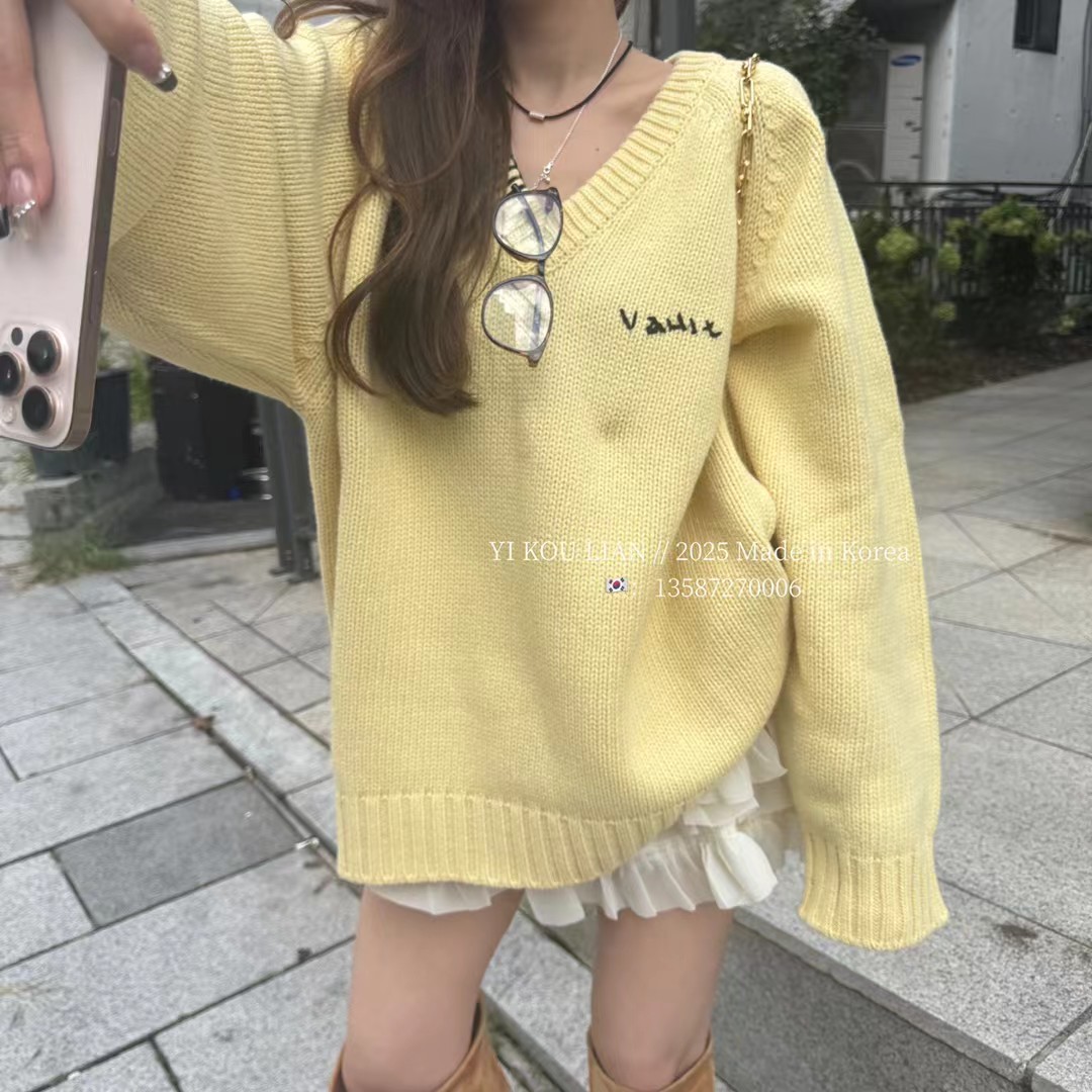 韩国东大门2025秋季新款韩版显瘦慵懒风v领中长款毛衣上衣针织衫