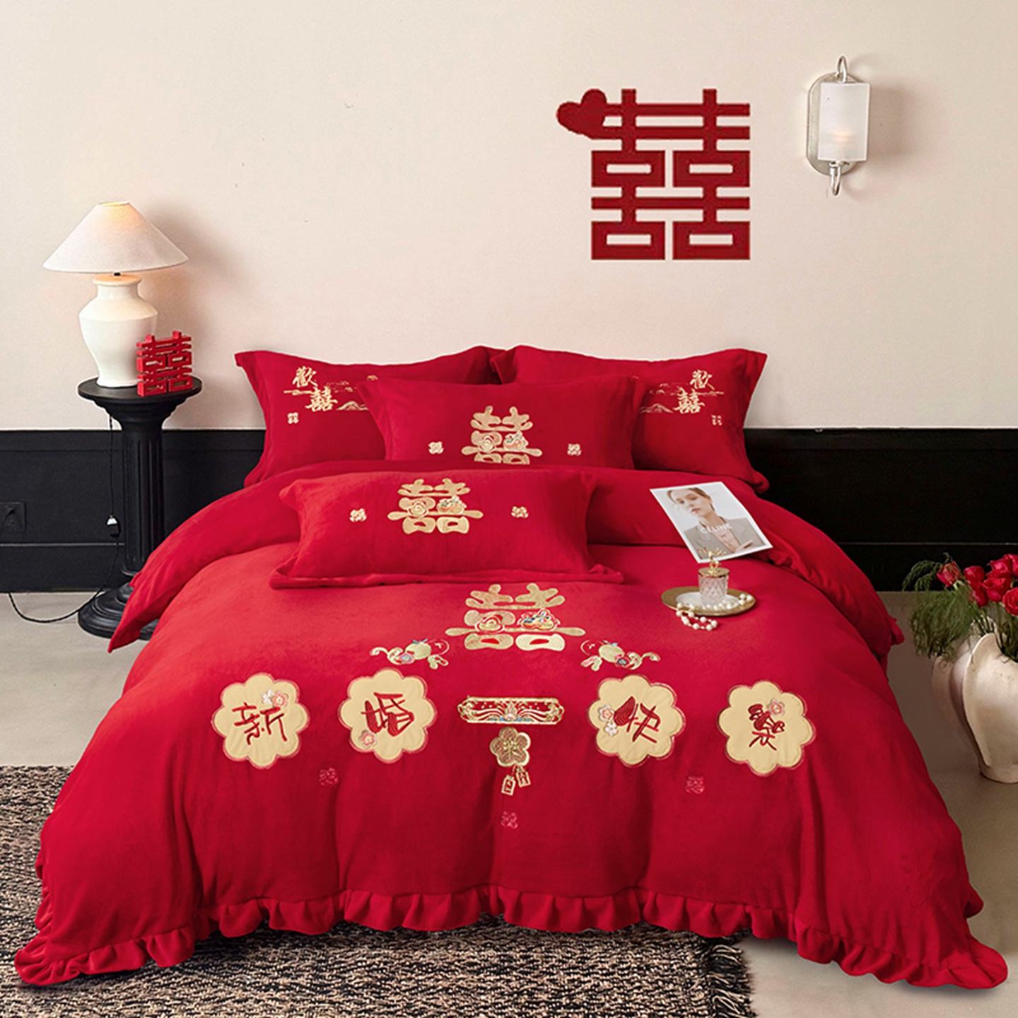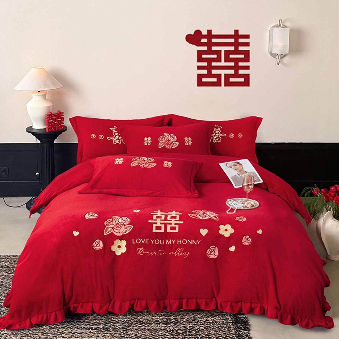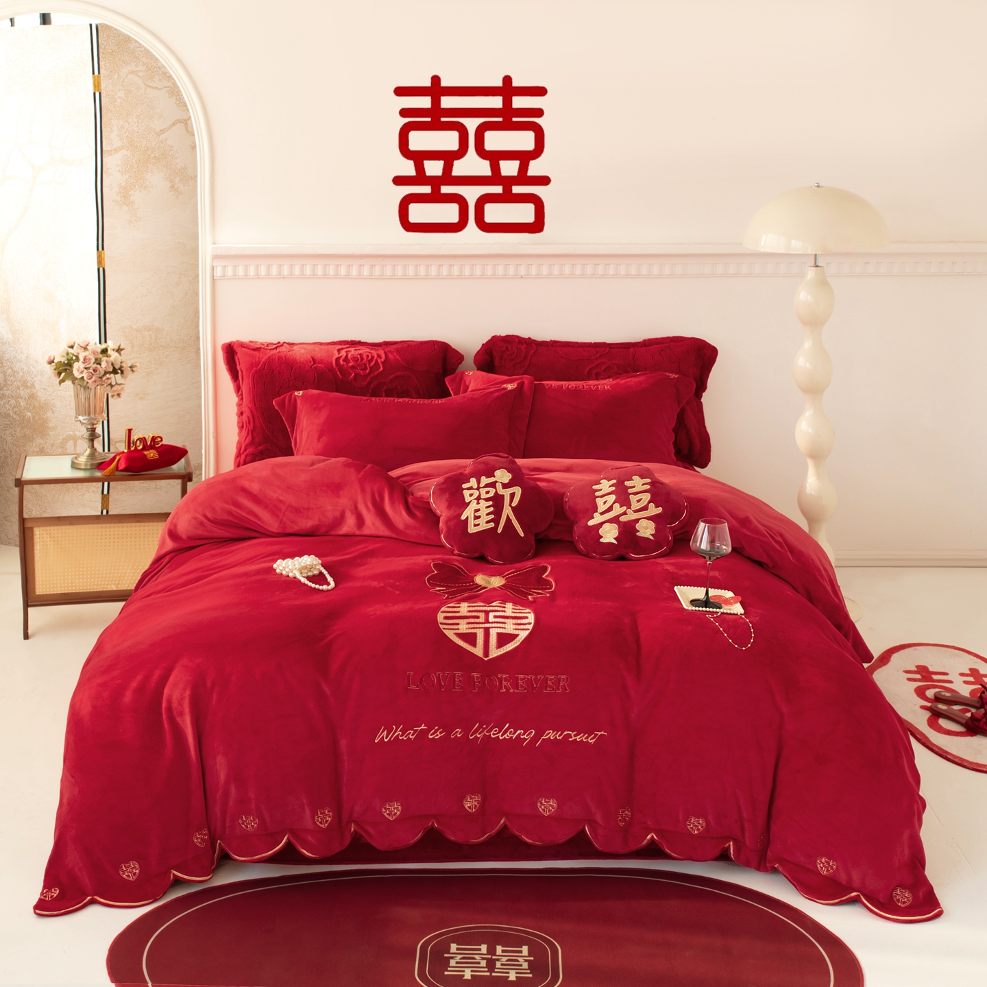 2025新款中式婚庆结婚陪嫁刺绣花大红色牛奶绒四件套冬季双面加绒
