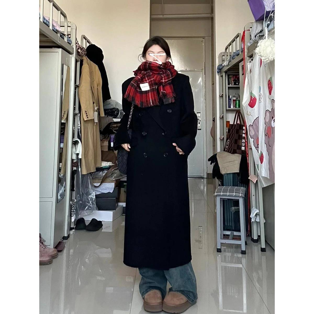 高级感黑色毛呢外套女2024秋冬新款小个子中长款正肩西装呢子大衣