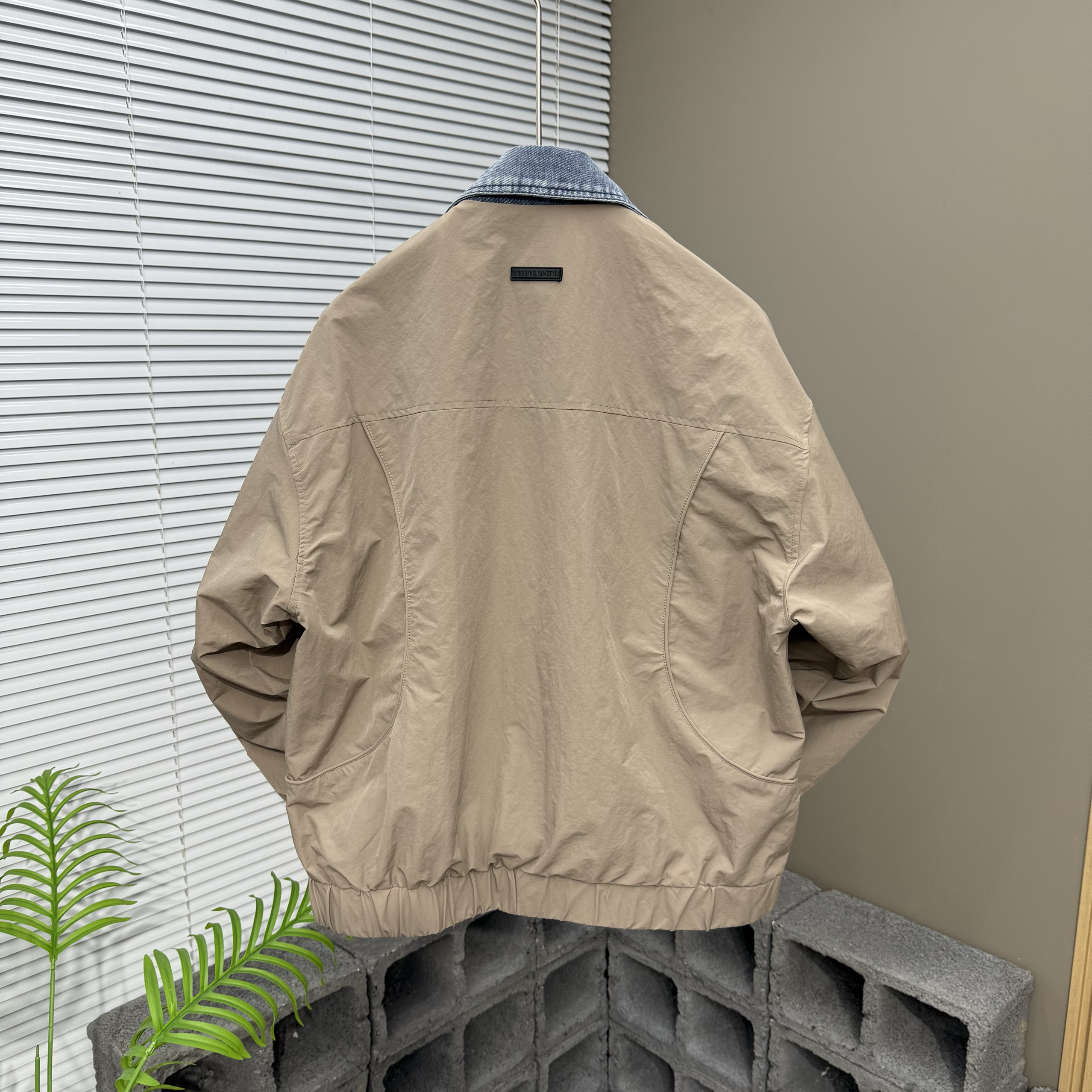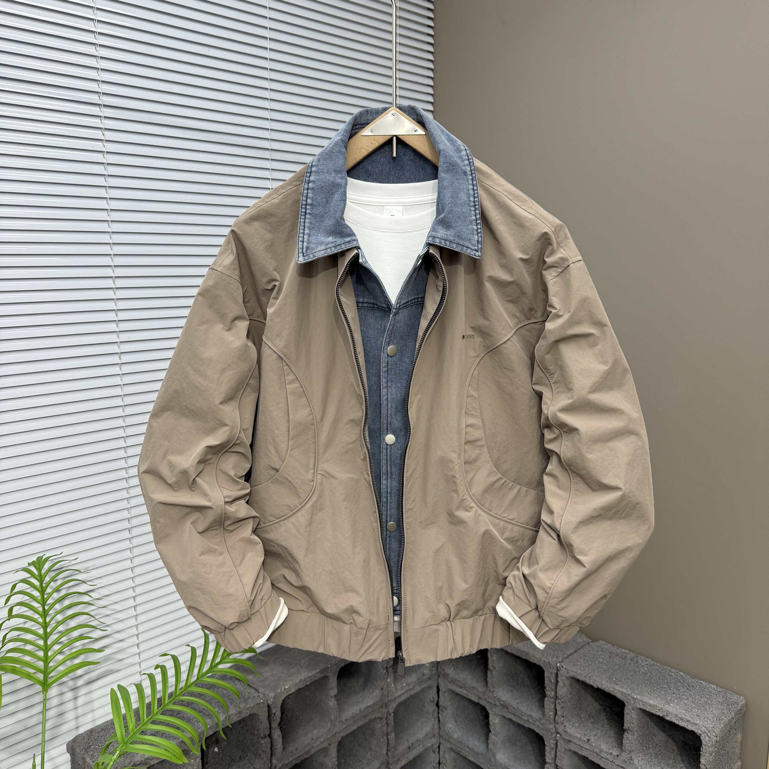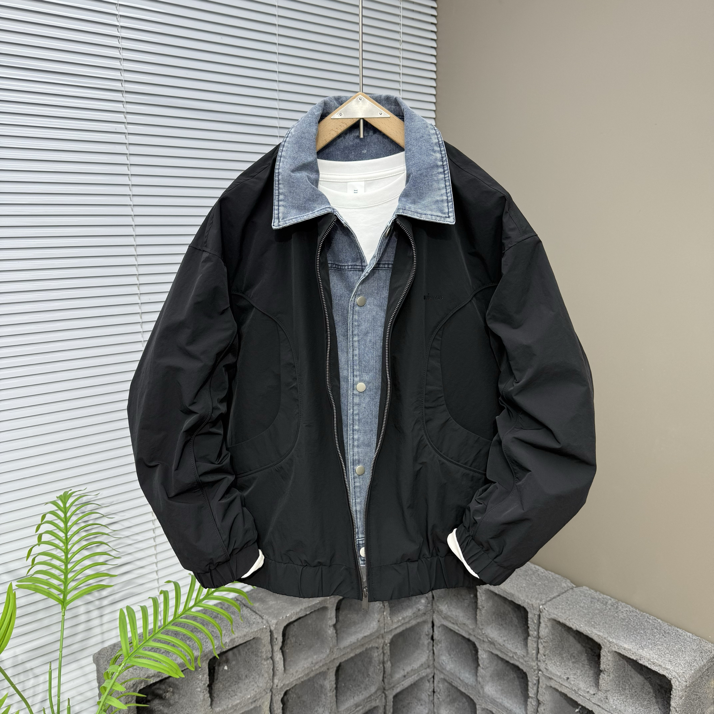 宽松潮牌牛仔拼接假两件夹克男士春季痞帅翻领休闲外套衬衫领上衣