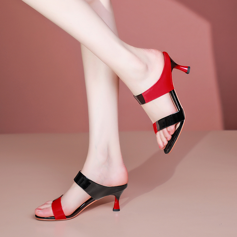 高跟凉鞋女凉拖细跟夏季外穿半拖中跟真皮拼色露趾鞋子百搭时装鞋