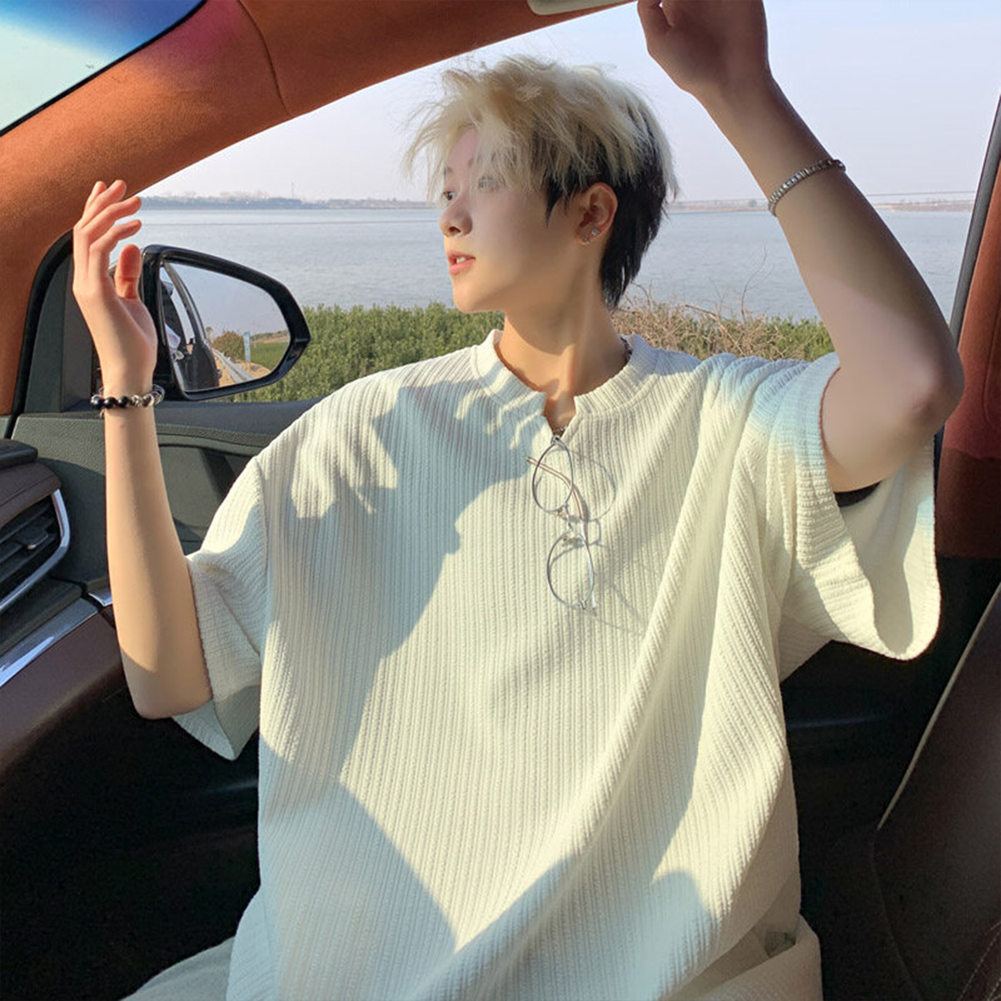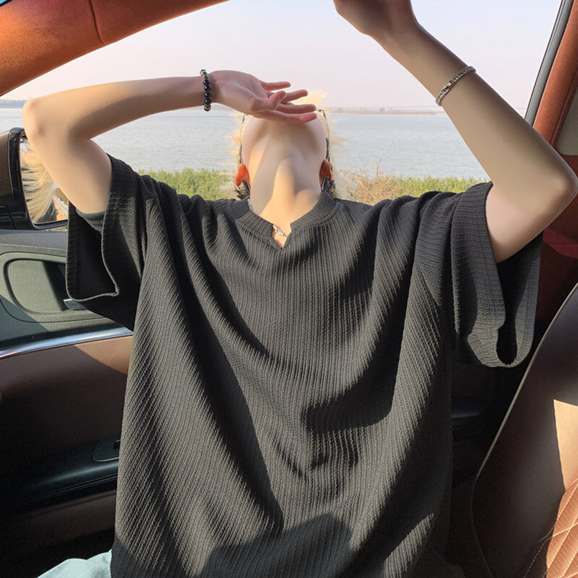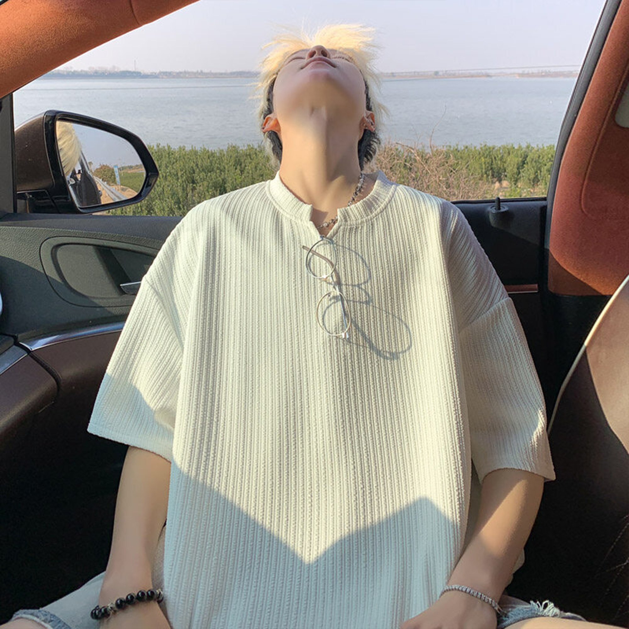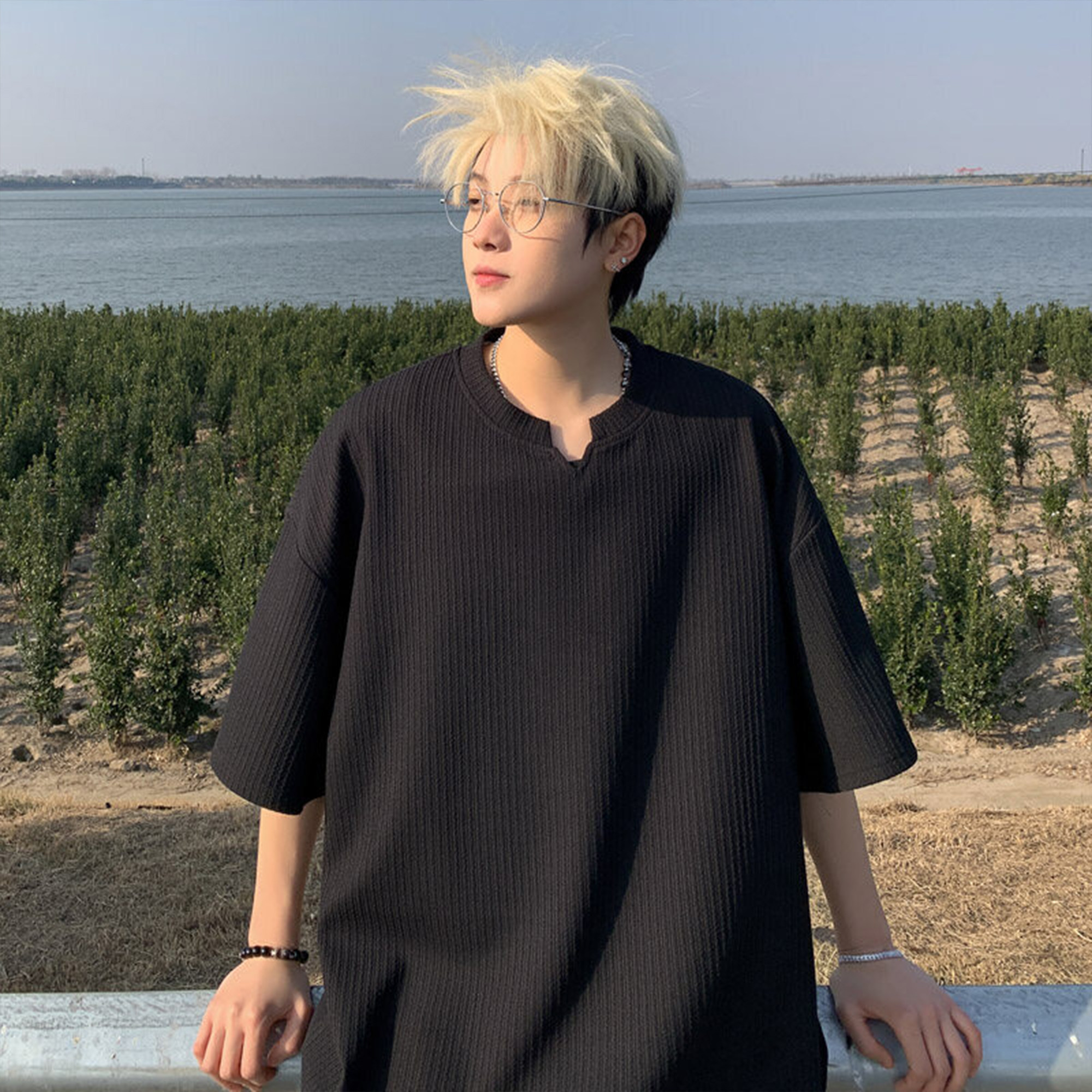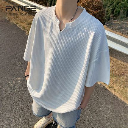 胖胖哥纯色小v领短袖T恤男夏季百搭宽松简约大码上衣ins潮牌体恤