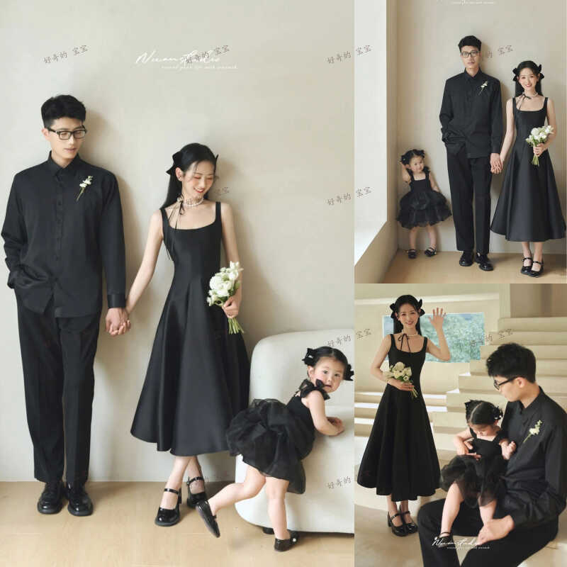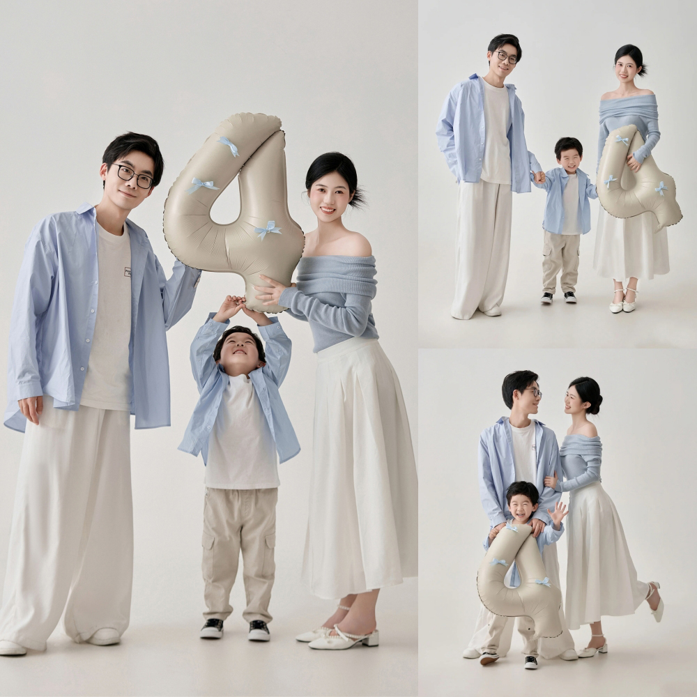 小红书同款全家福摄影服装家庭装三口亲子装影楼拍照蓝色清新套装