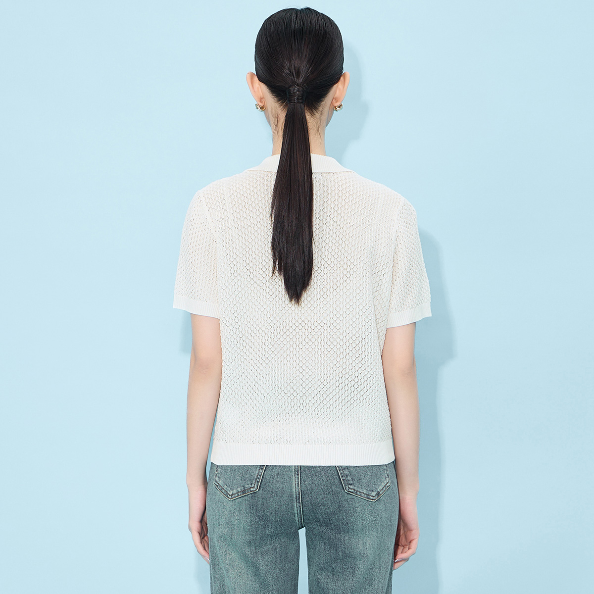 马天奴2025春夏新款纯色提花针织衫翻领套头上衣短袖小衫女装T恤