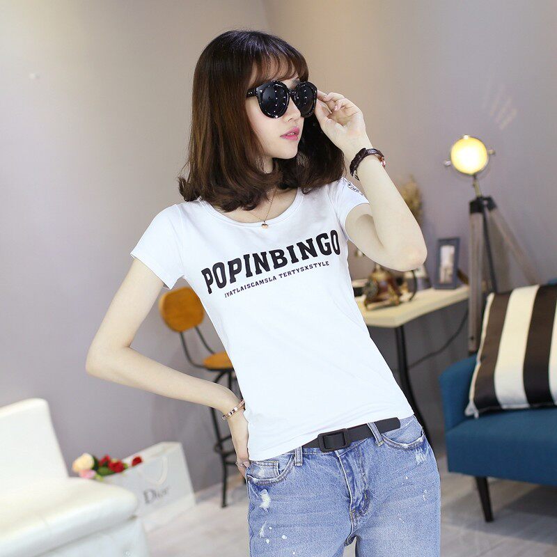 2025夏装新款韩版纯棉t恤女修身短袖圆领印花上衣百搭简约打底衫