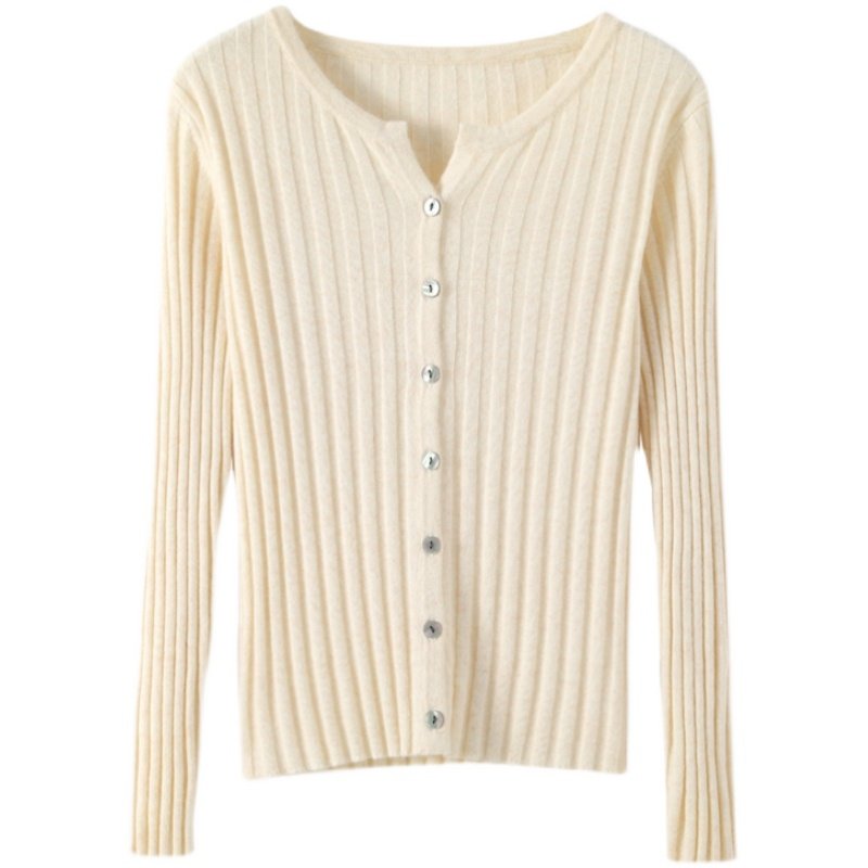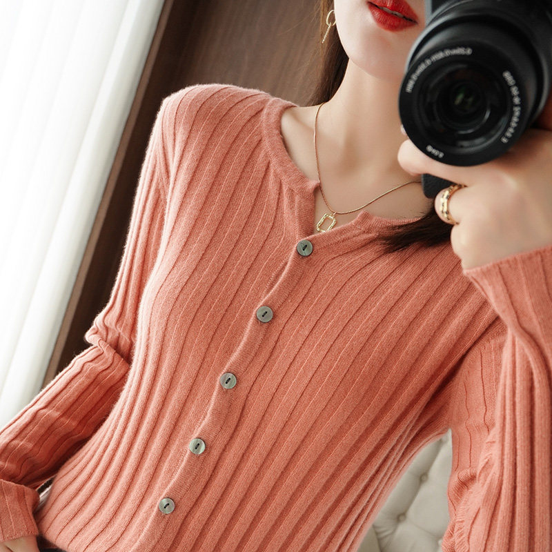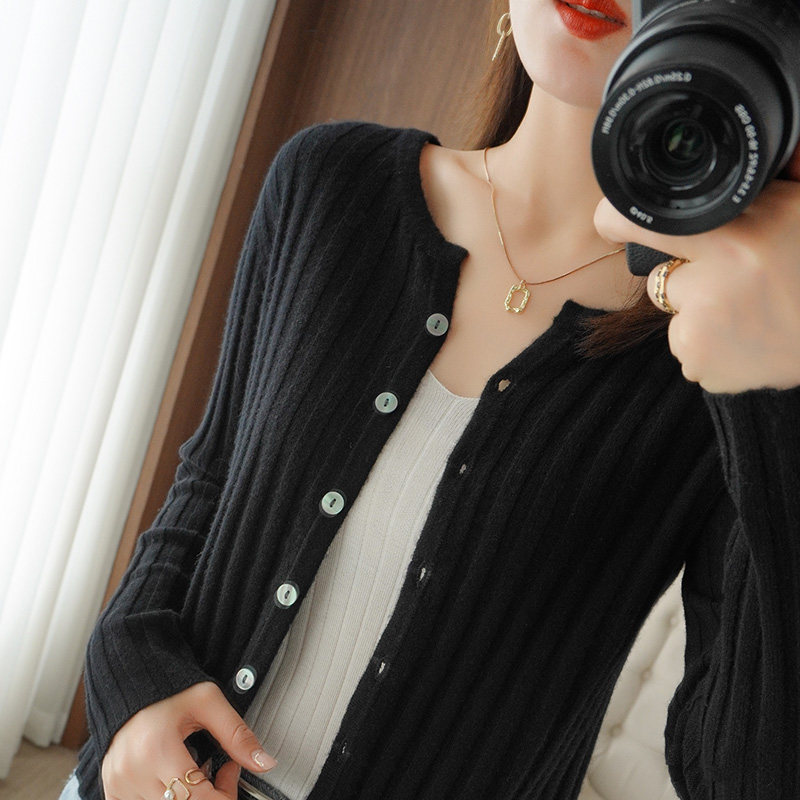 2023年秋冬新款羊绒开衫女 纯色针织衫圆领短款坑条毛衣外套长袖