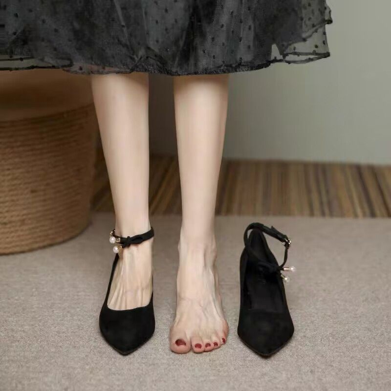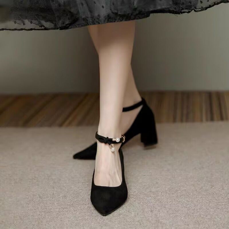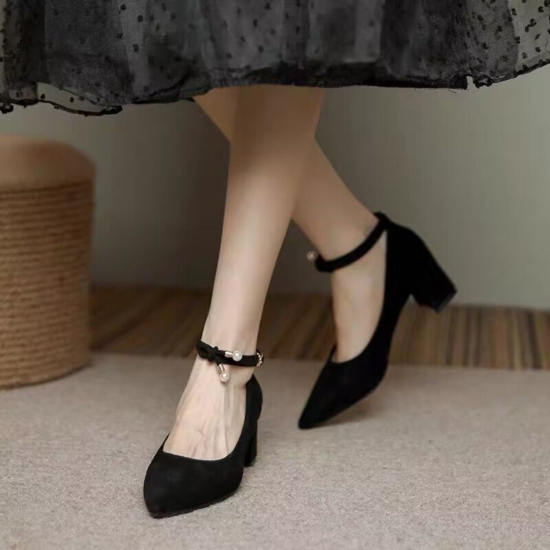春季配裙子高跟鞋设计感气质名媛风一字带珍珠单鞋女粗跟中跟女鞋