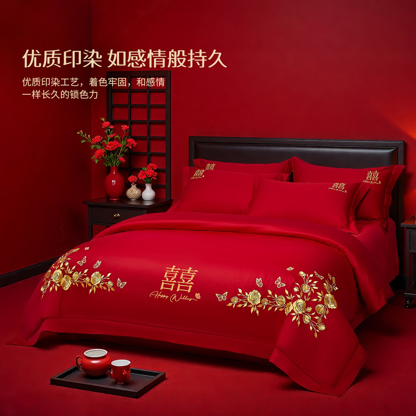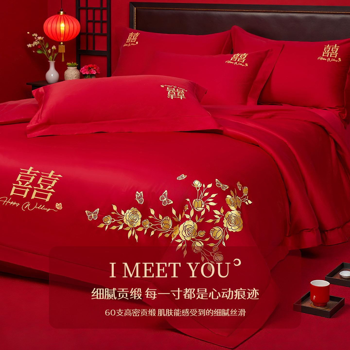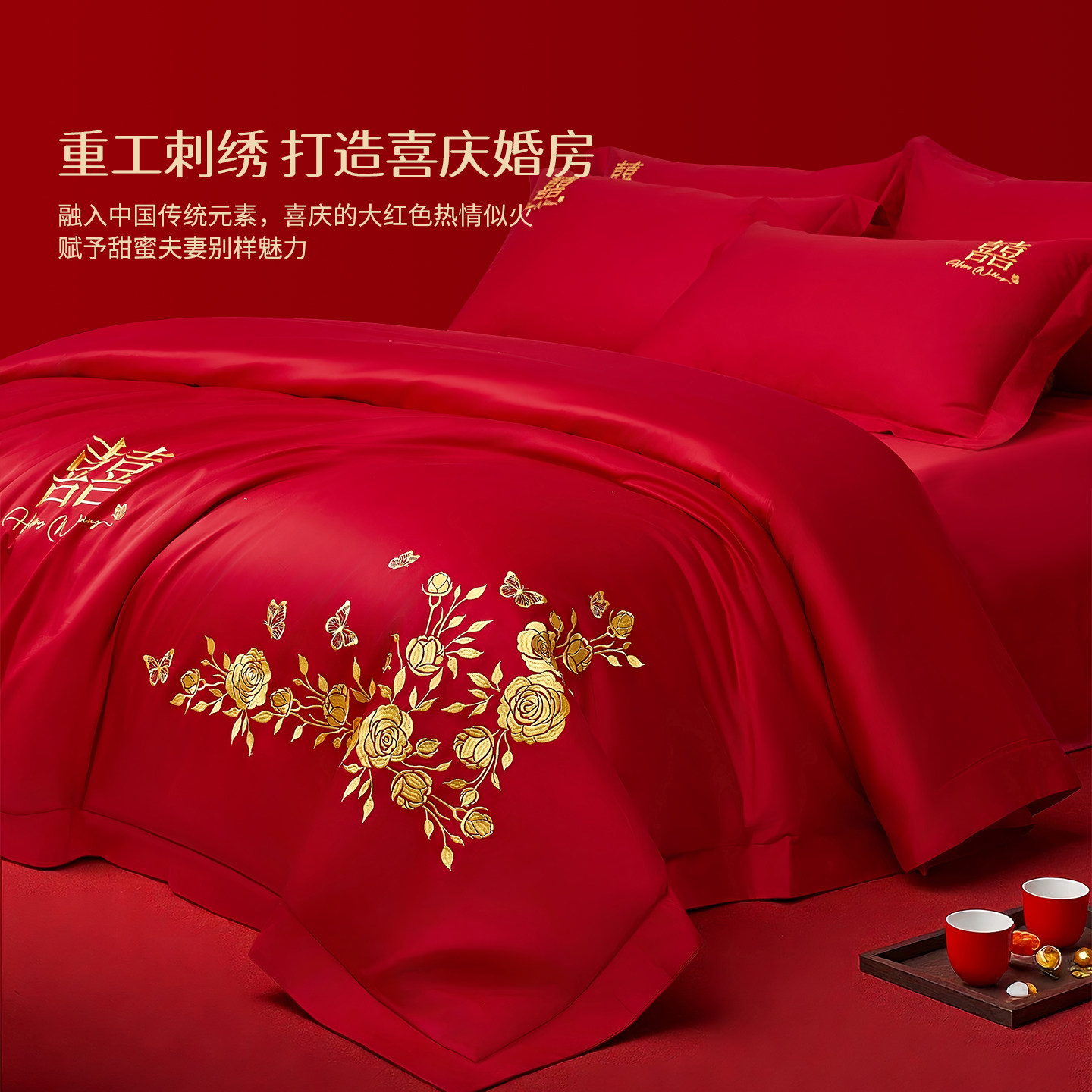 红豆婚庆四件套60支全棉喜庆结婚龙凤床品纯棉婚嫁婚床新婚大红