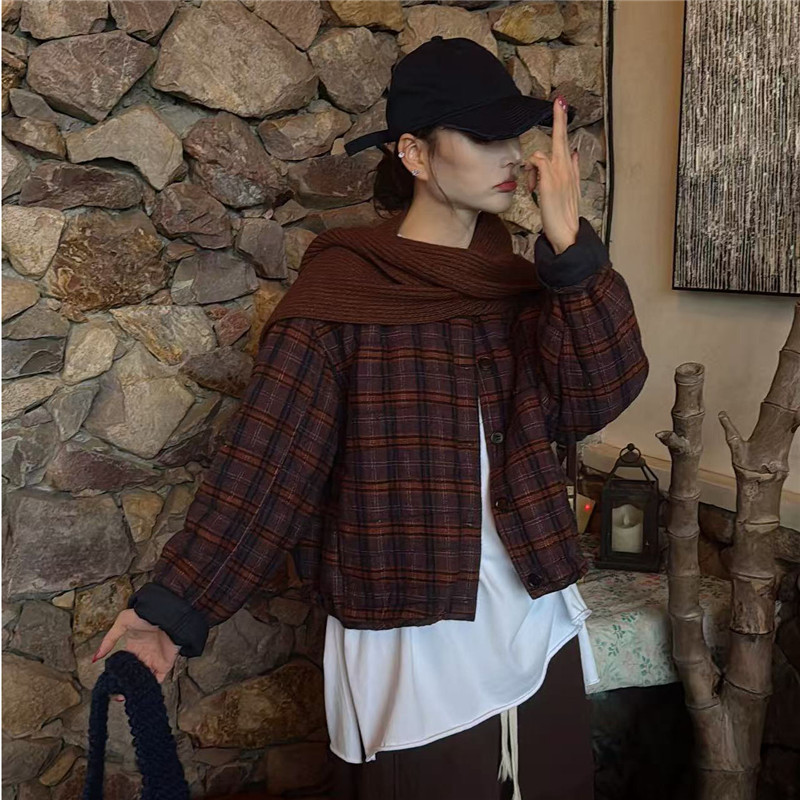 TYJR 冬季新款2025韩版宽松圆领长袖棉衣棉服格子夹棉外套女55711