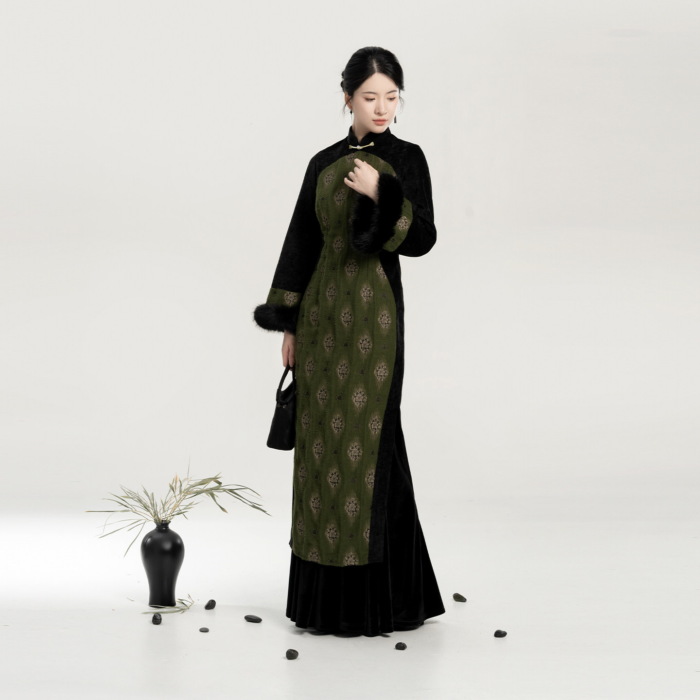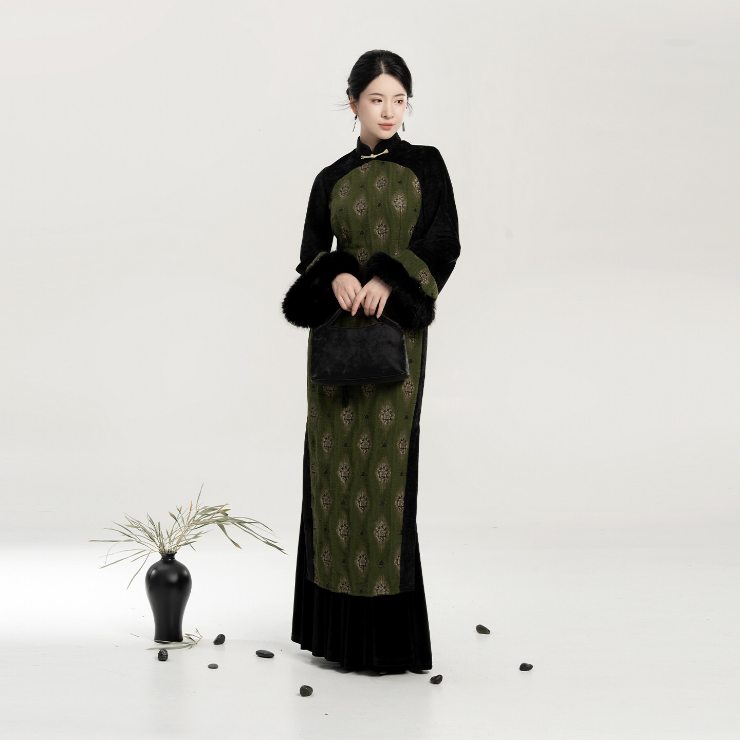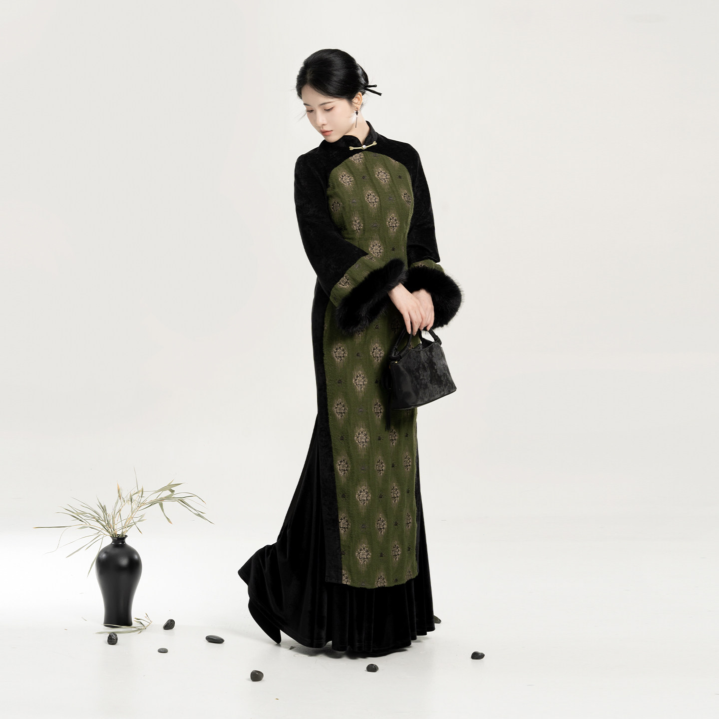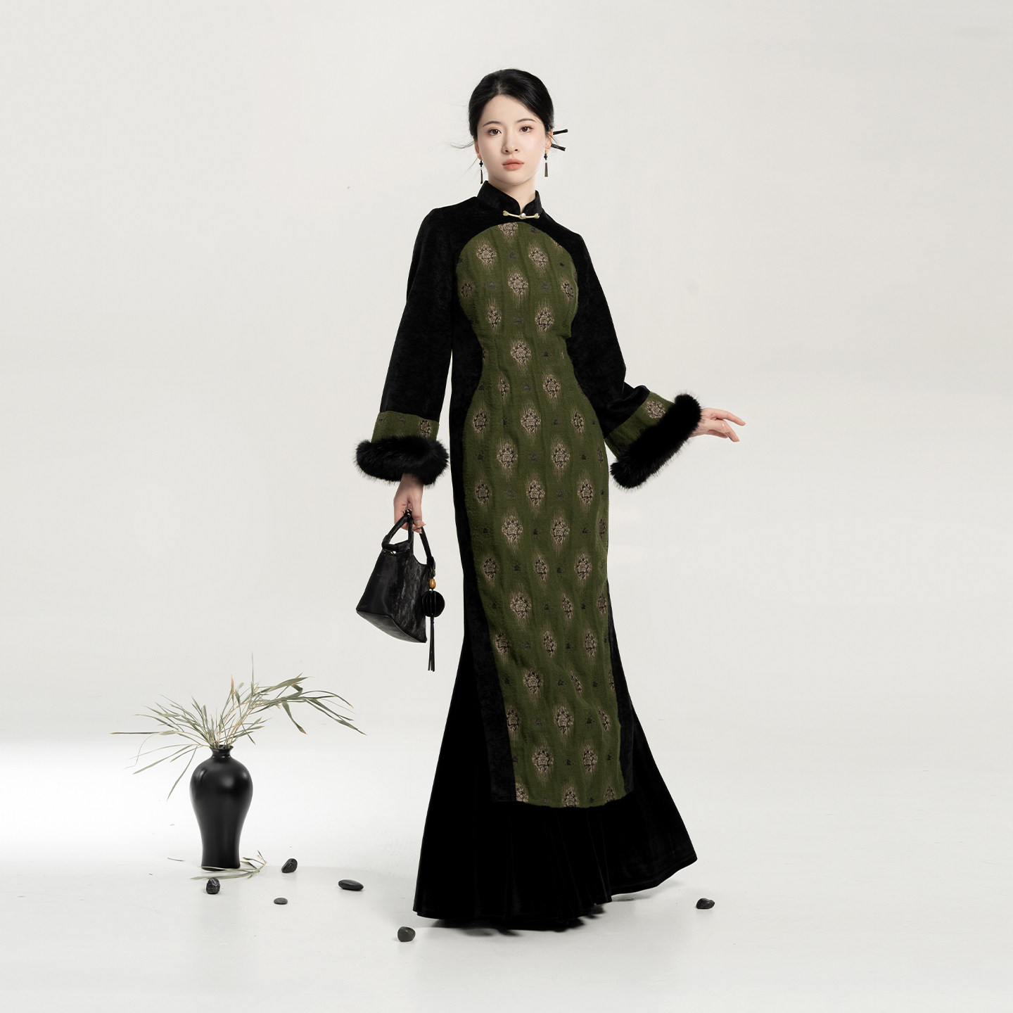 织造司[青黛湖]新中式丝绒改良旗袍长袖连衣裙女修身鱼尾裙半身裙