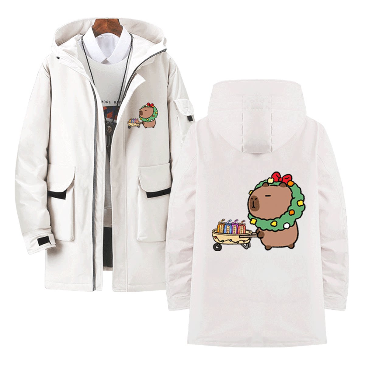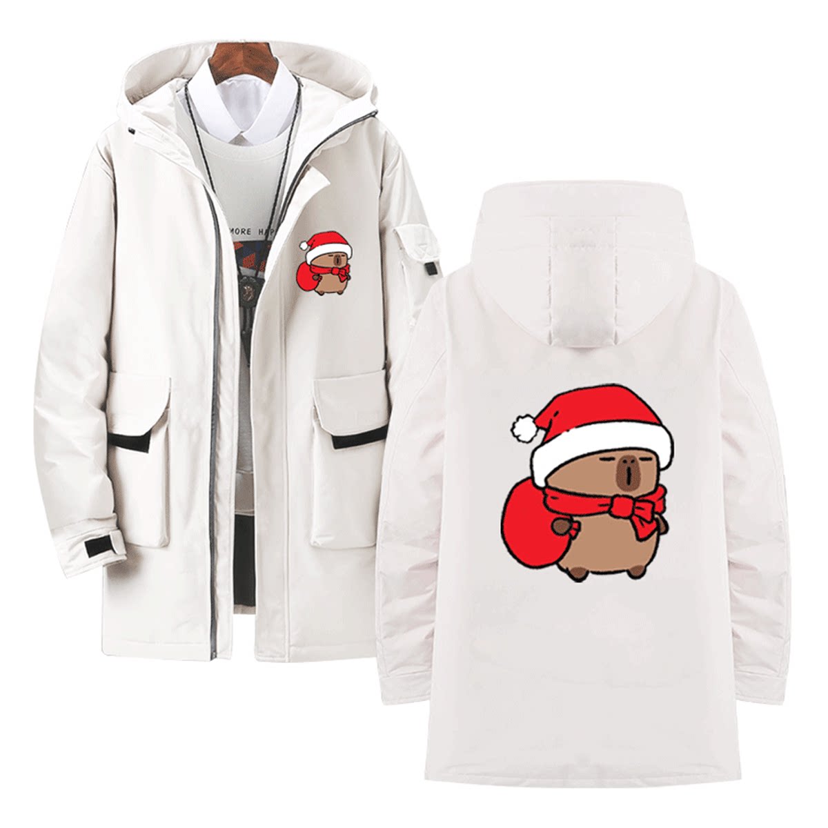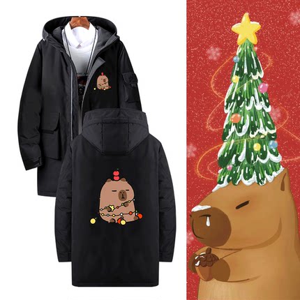 卡皮巴拉水豚君可爱萌系联名圣诞节男女定制连帽中长款保暖羽绒服