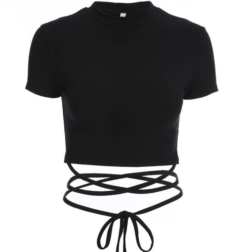 纯色短款露脐交叉绑带短袖T恤女夏季百搭紧身显瘦高腰小心机上衣
