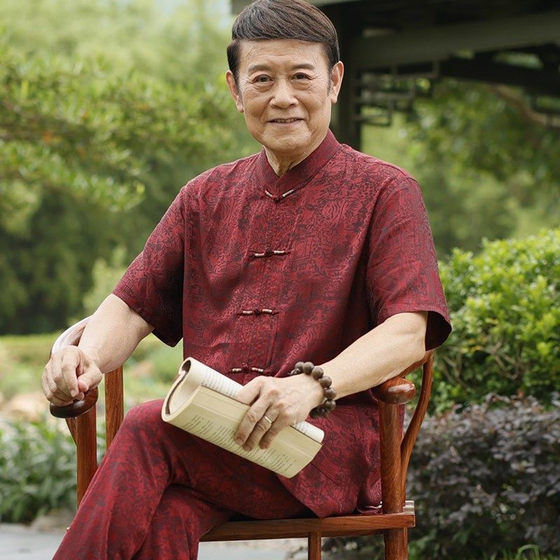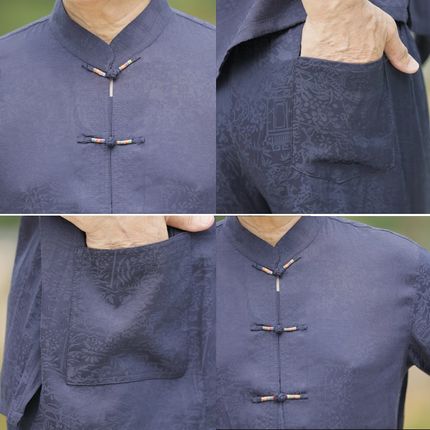 夏季唐装男衬衫短袖中老年人中山装爸爸套装爷爷夏装绵绸衣服男装