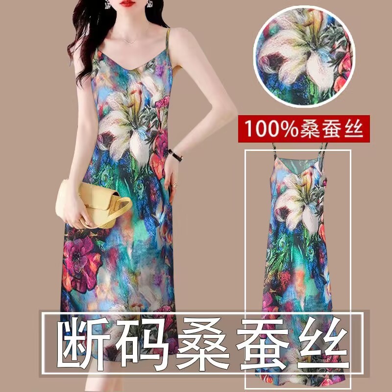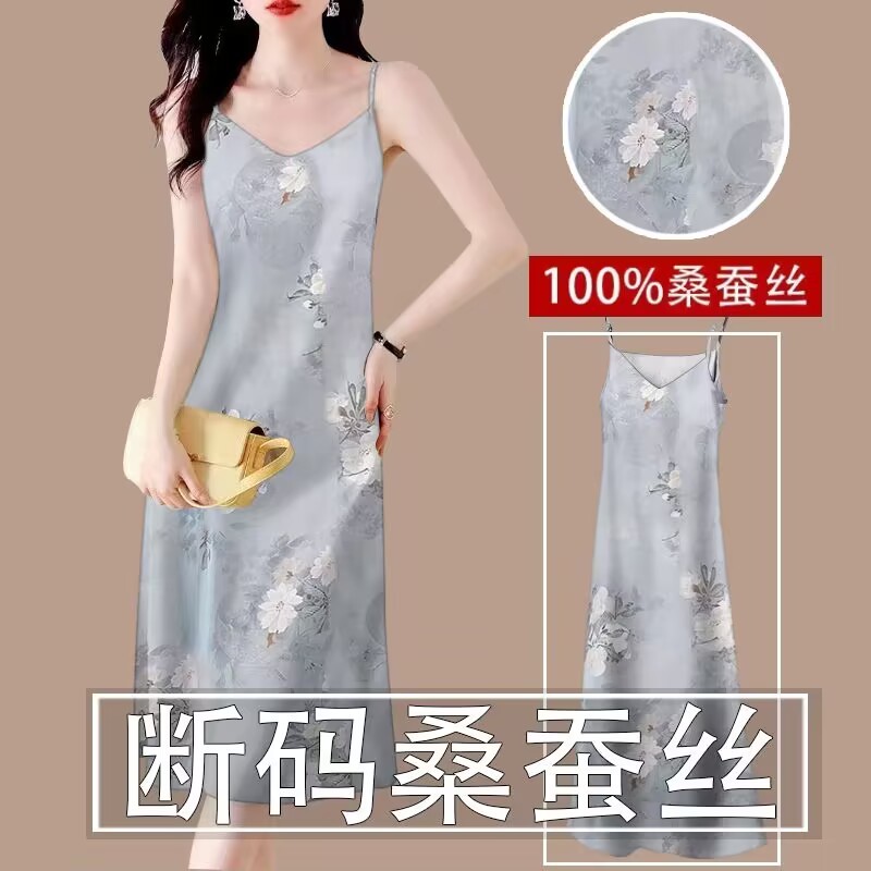 真丝吊带连衣裙女夏季宽松内搭V领长裙100%桑蚕丝缎面吊带背心裙