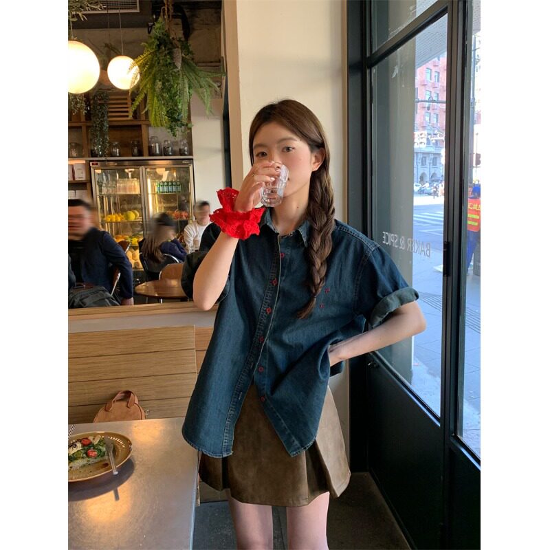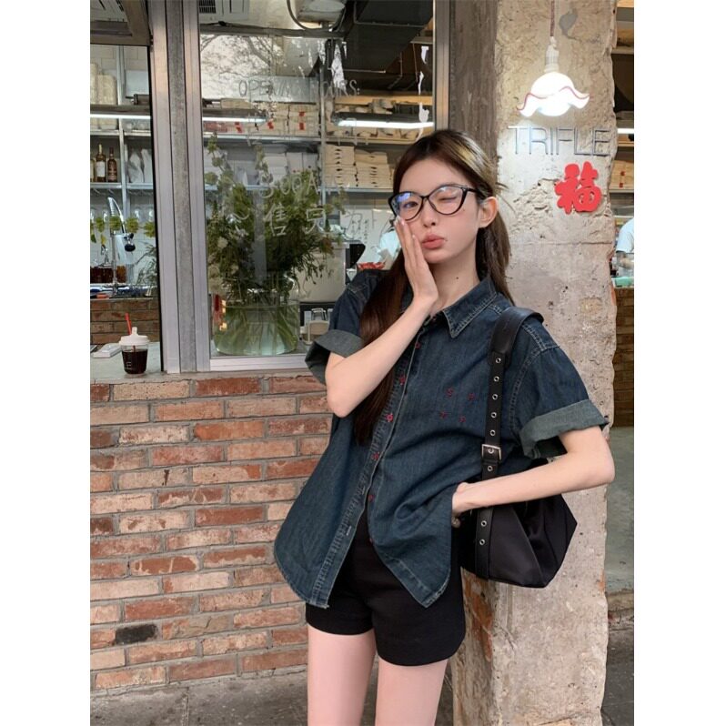 休闲慵懒短袖牛仔衬衫女夏季衬衣法式高级设计感刺绣宽松气质上衣