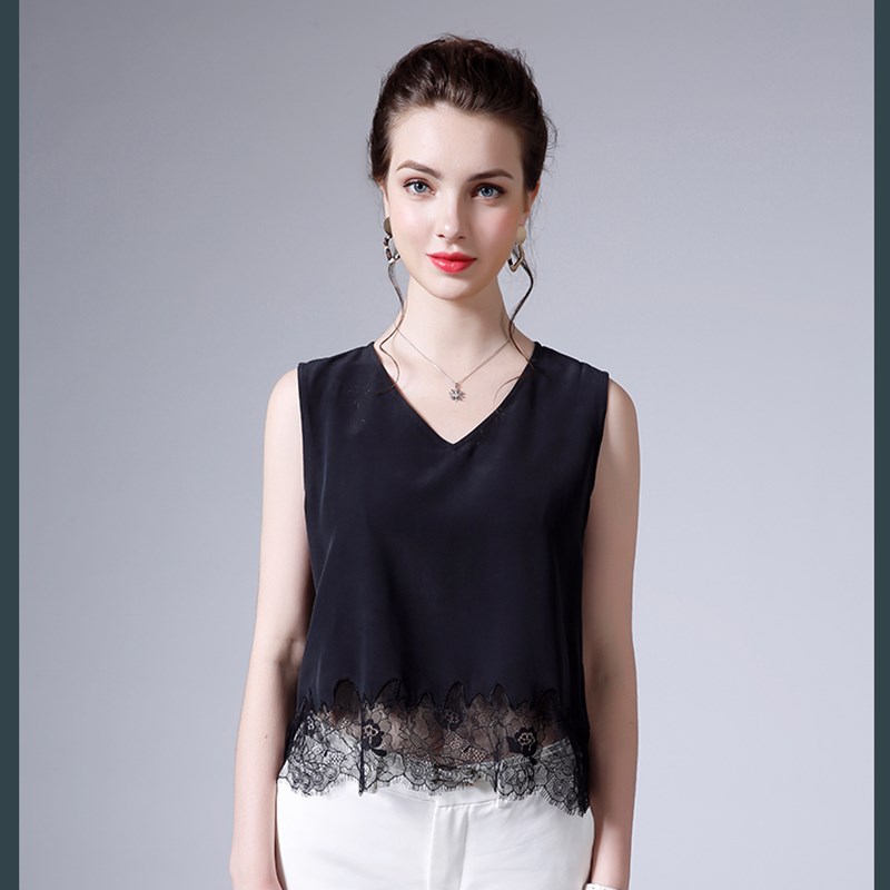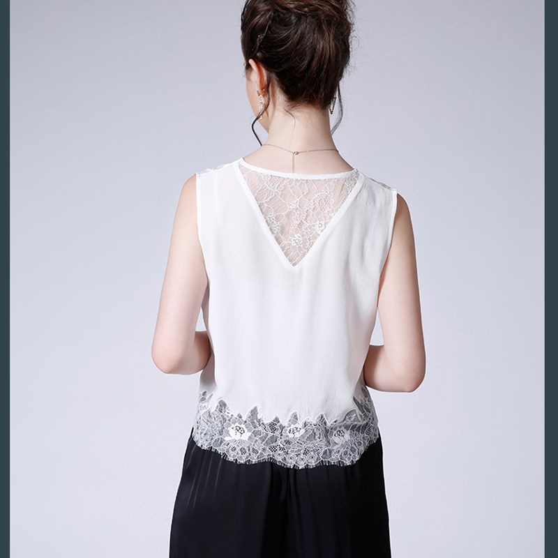蕾丝背心女芙蓉缎内搭打底无袖上衣T恤吊带宽松V领优雅拼接可外穿