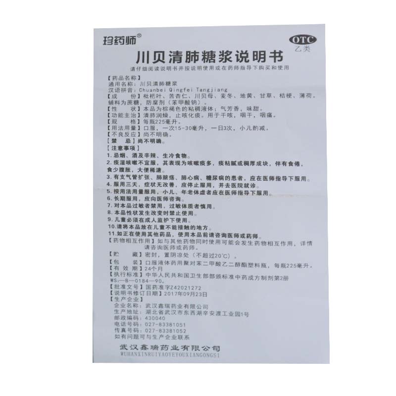 【珍药师】川贝清肺糖浆225ml*1瓶/盒