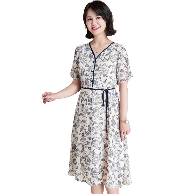 中年妈妈夏装短袖连衣裙2024新款洋气40岁50中老年女气质雪纺裙子