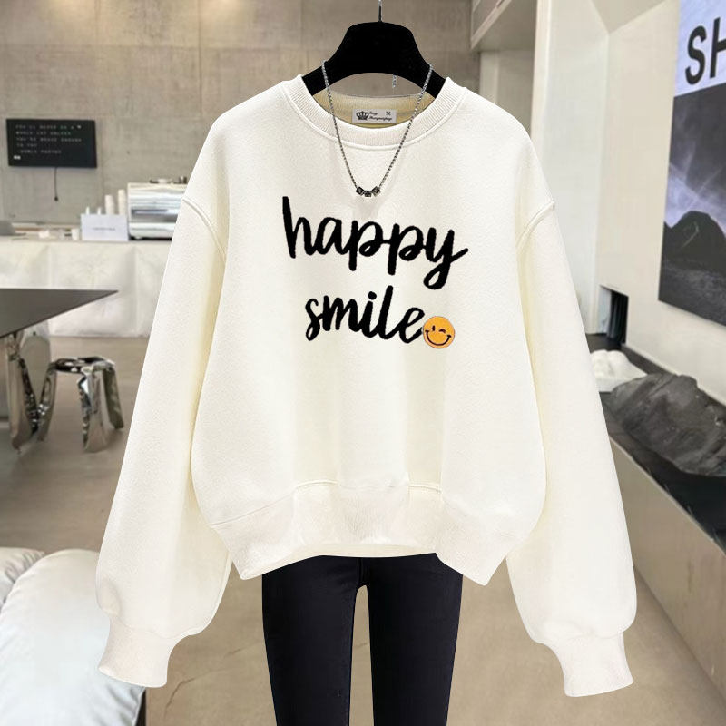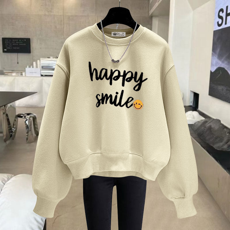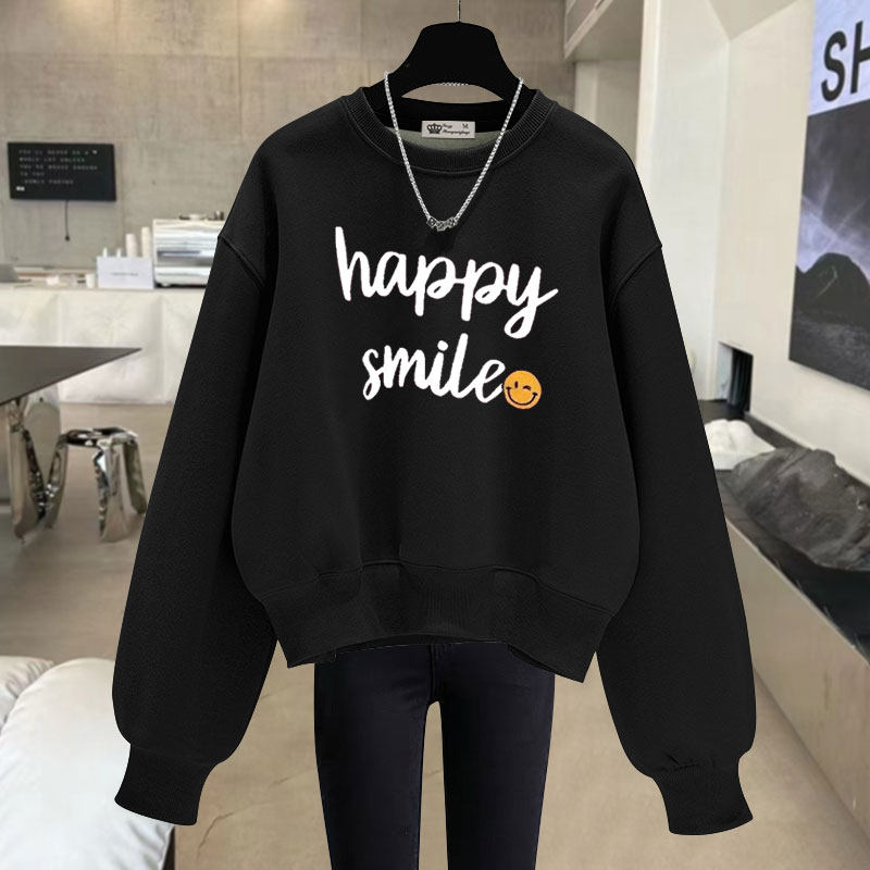 2025春秋冬季字母笑脸休闲短款长袖加绒加厚宽松套头圆领卫衣女潮