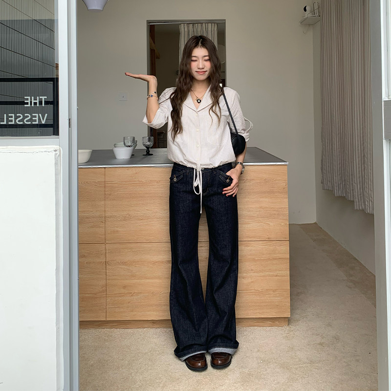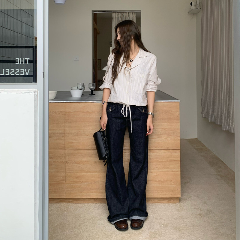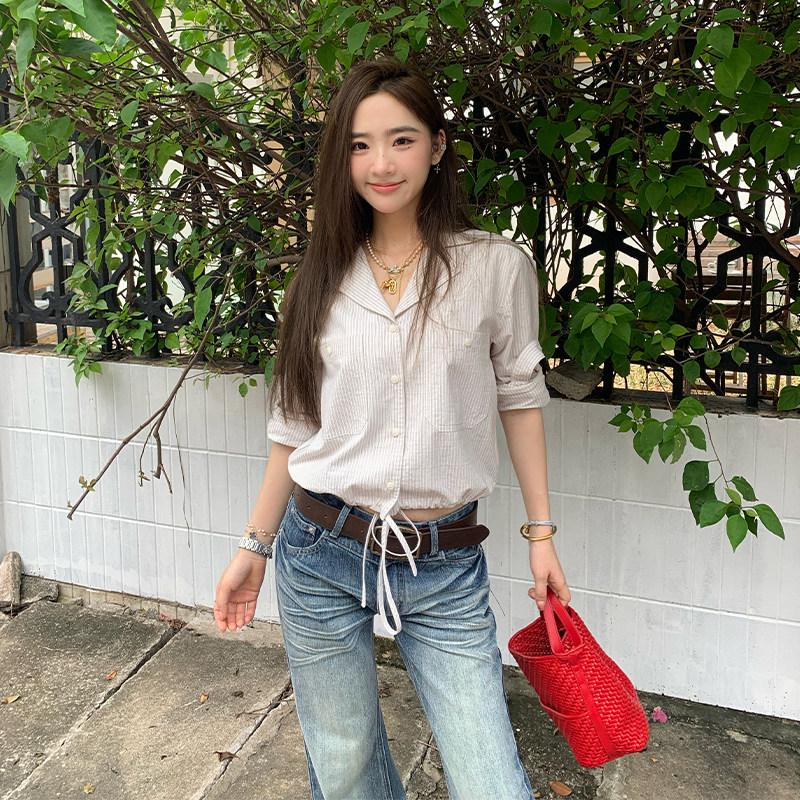 【清仓价】橘子树在哪儿韩系条纹衬衫女秋小众设计感衬衣抽绳上衣