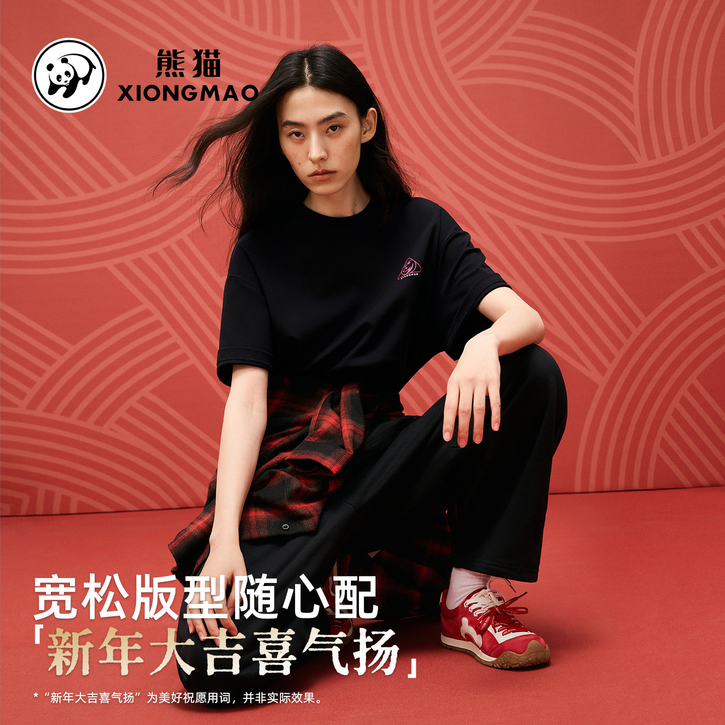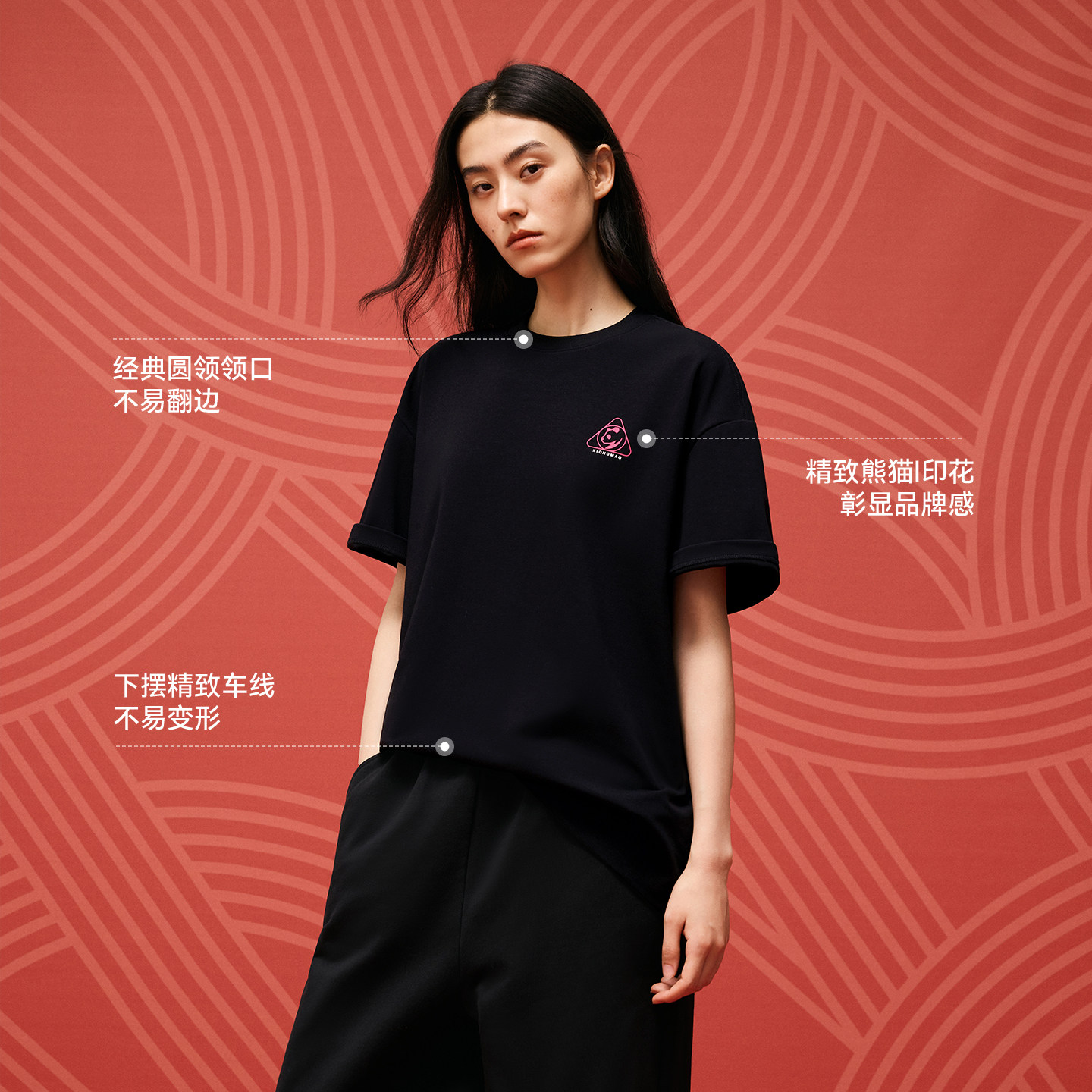熊猫黑色刺绣短袖T恤2026春季