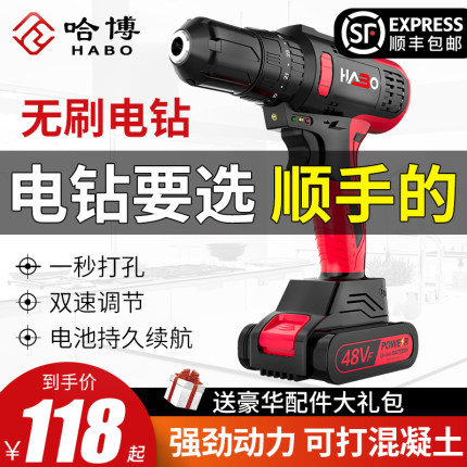 哈博充电式手电钻无刷手枪钻家用冲击手钻工具电动螺丝刀锂电转