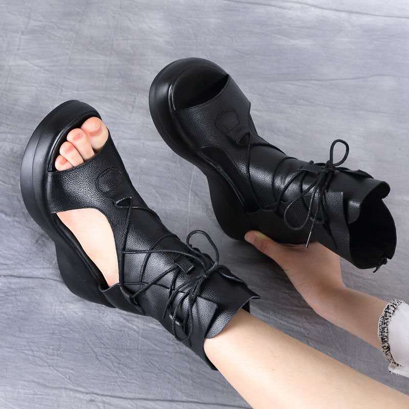 高跟凉靴真皮坡跟中年洞洞鞋全牛皮厚底凉鞋女夏妈V妈高帮增高女