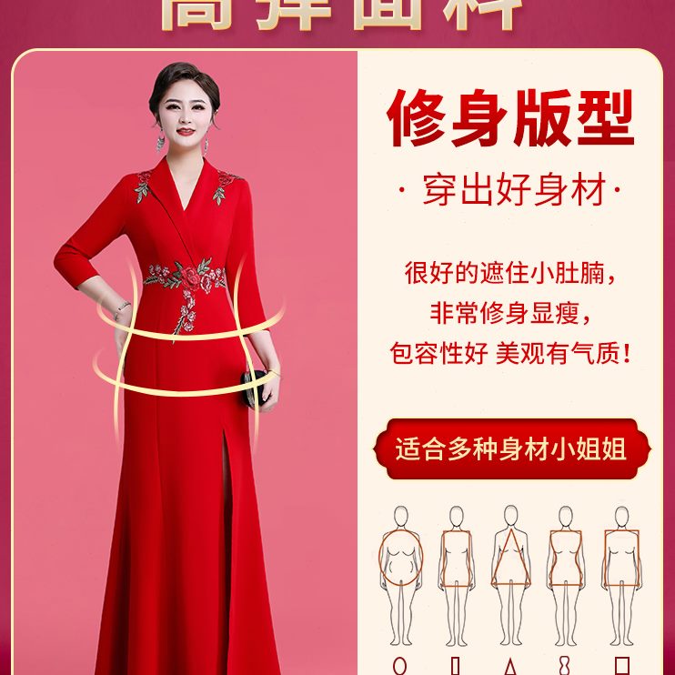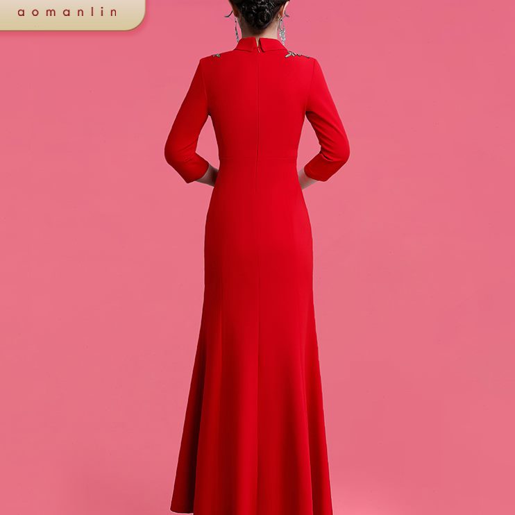 走秀旗袍高端长款澳曼琳演出服红色优雅舞台改良气质中国风女修身