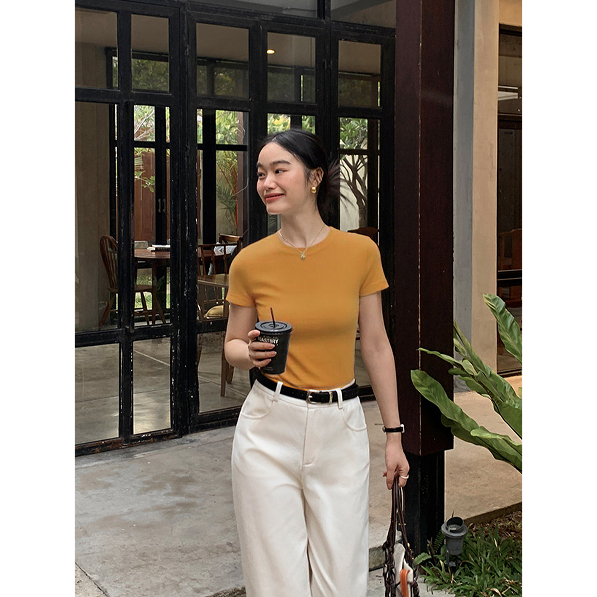 pusumede 正肩圆领短袖t恤女夏季新款百搭短款修身针织打底上衣