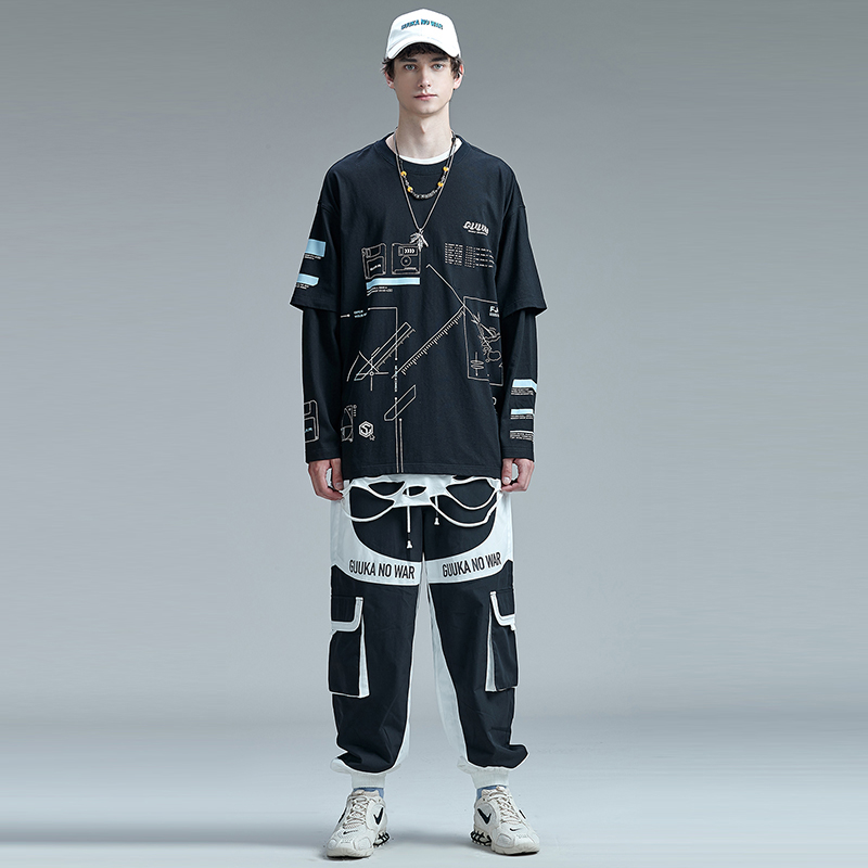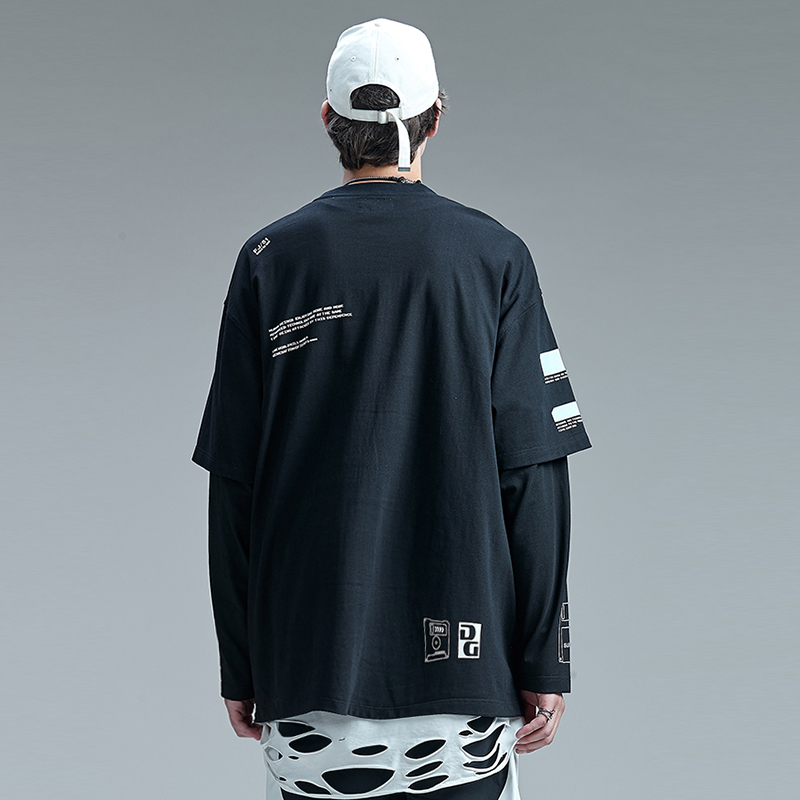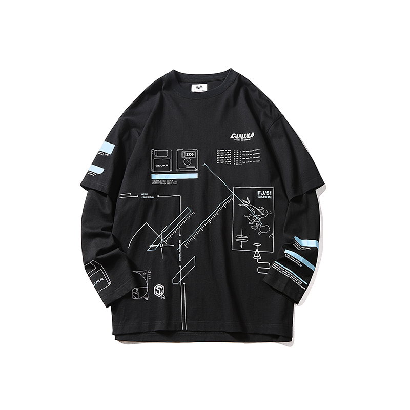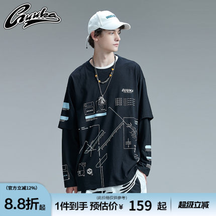 GUUKA黑色长袖T恤男潮牌 汪苏泷同款嘻哈圆领运动假两件长T恤宽松