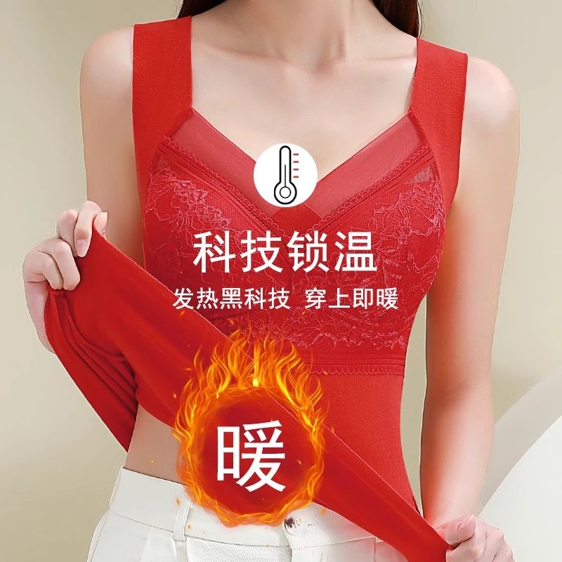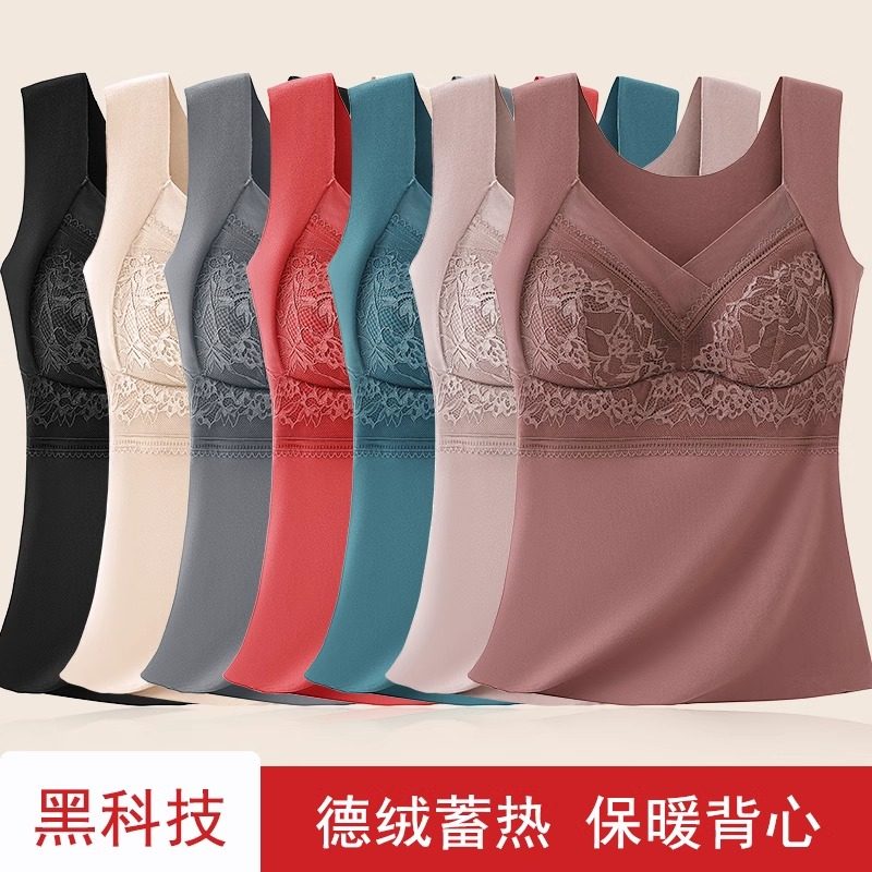 德绒蕾丝保暖背心女带胸垫大码加绒加厚发热内衣紧身打底衫秋冬季