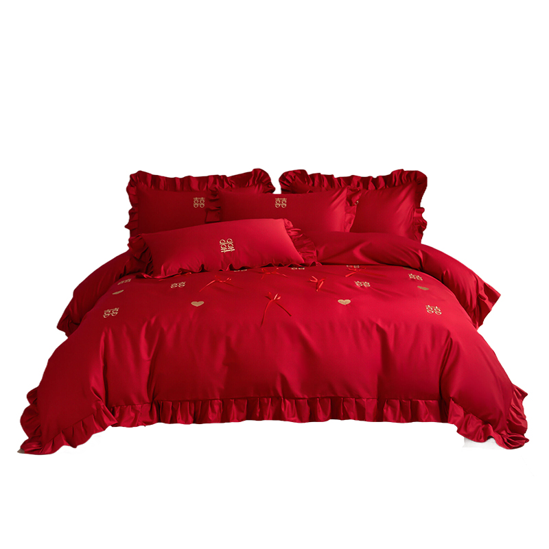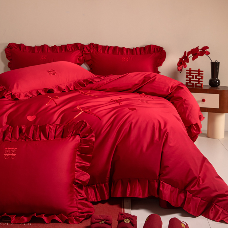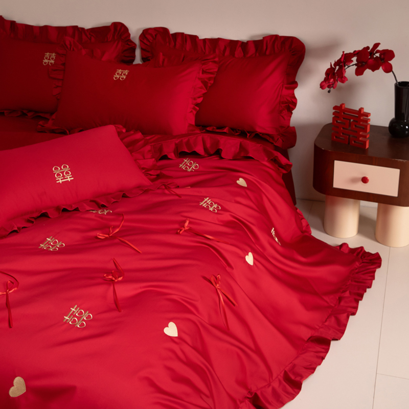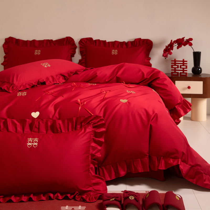 高档中式喜字结婚四件套大红色新婚陪嫁被套婚庆床上用品婚房备婚
