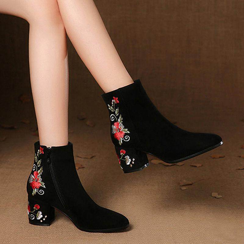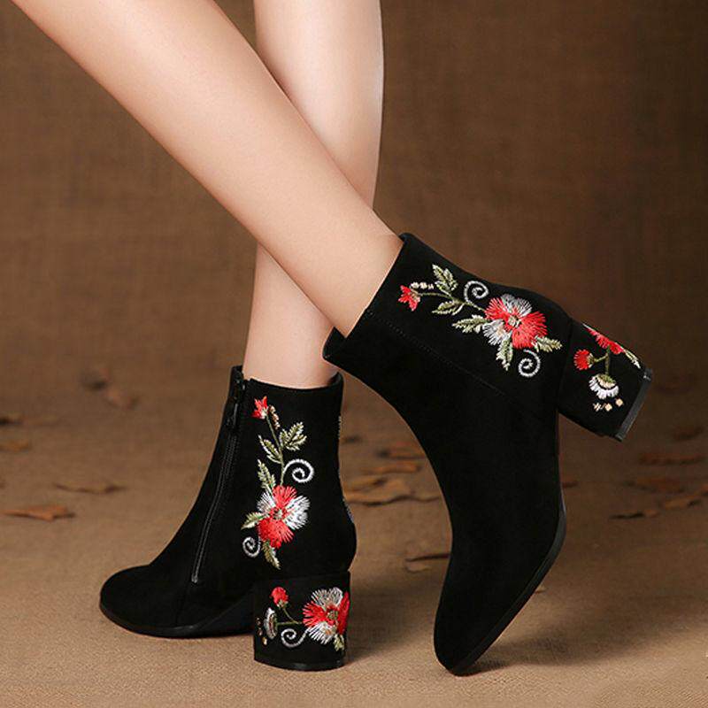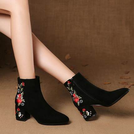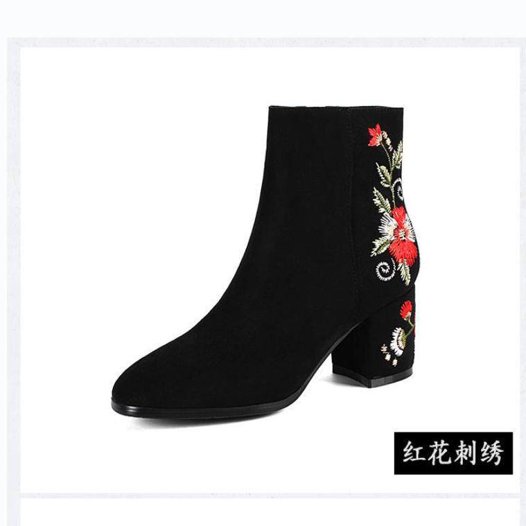 秋冬新款磨砂短靴粗跟加绒女鞋民族风软底绣花中跟中筒靴子单鞋女