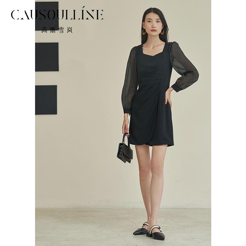 高斯雪岚春新款雪纺拼接连衣裙优雅气质都市收腰女裙高级感方领裙