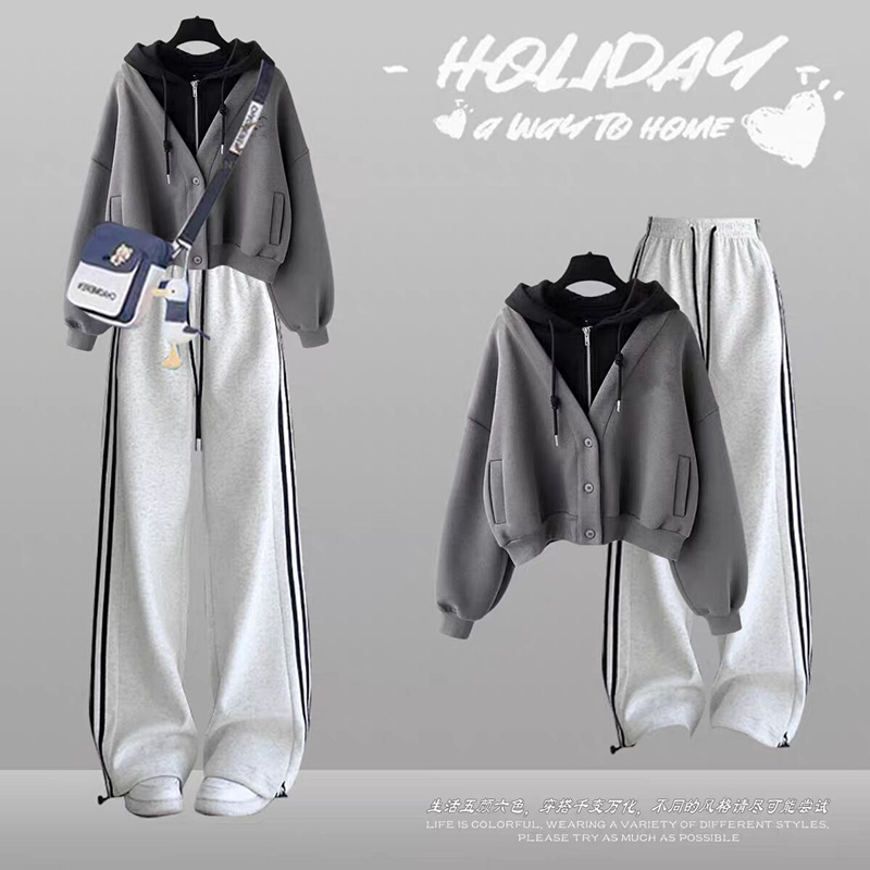 学生韩版假两件中大童连帽卫衣女秋装新款宽松显瘦阔腿运动裤套装