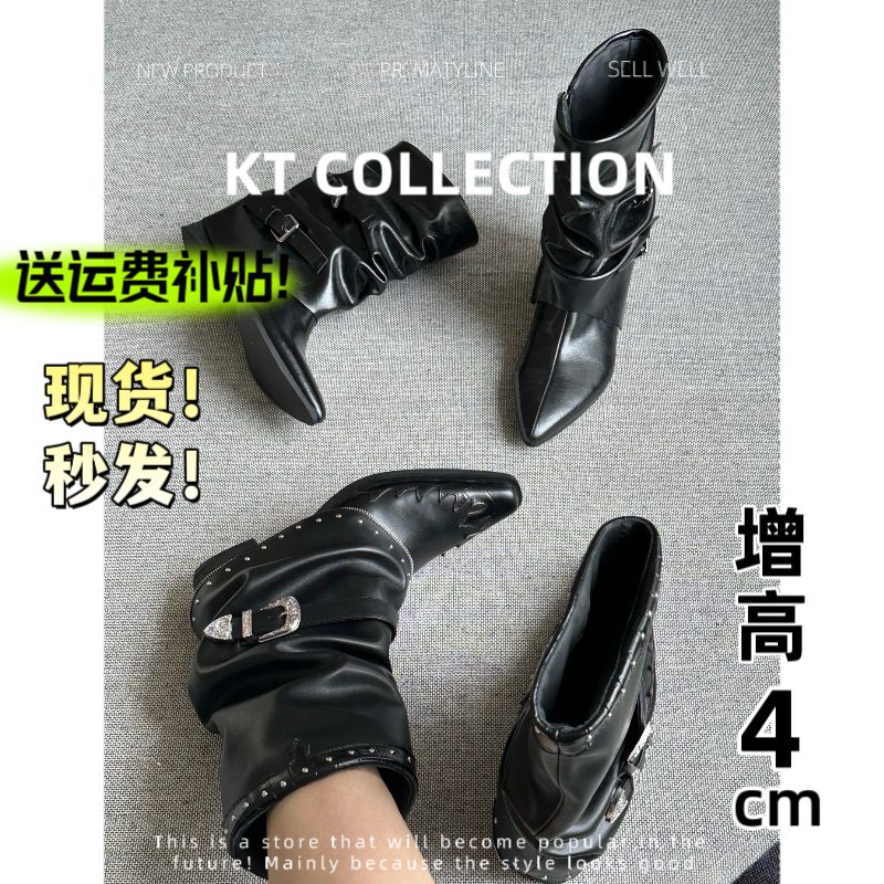 羊皮版!增高4cm~法式复古西部牛仔靴女粗跟厚底马丁靴骑士靴