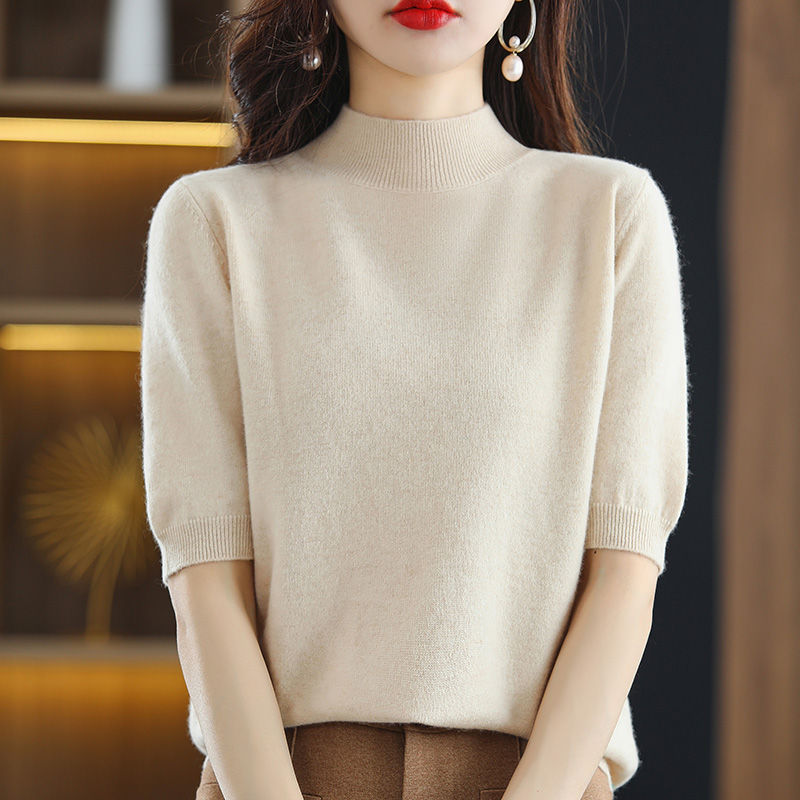 2025秋女半高领五分袖羊毛针织衫套头毛衣纯色打底衫宽松大码短袖