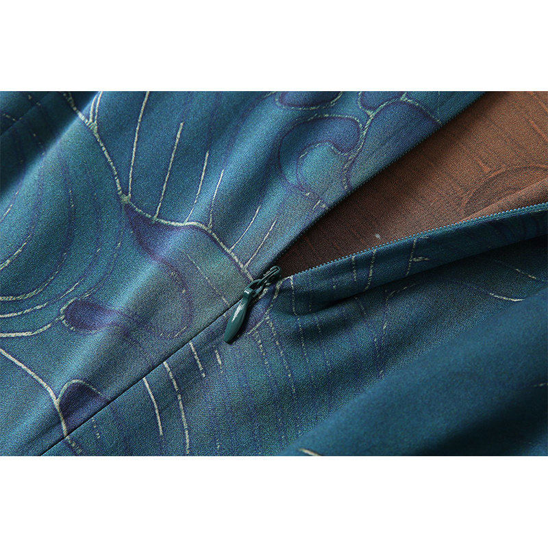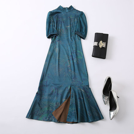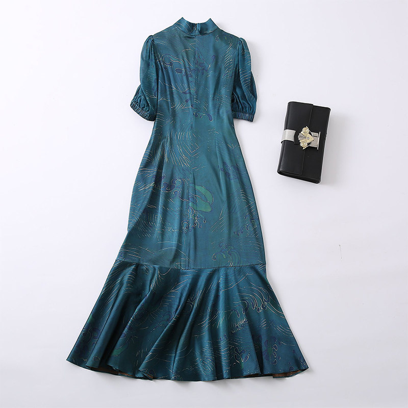 夏100%桑蚕丝香云纱提花连衣裙女文艺古典旗袍式立领短袖A字长裙